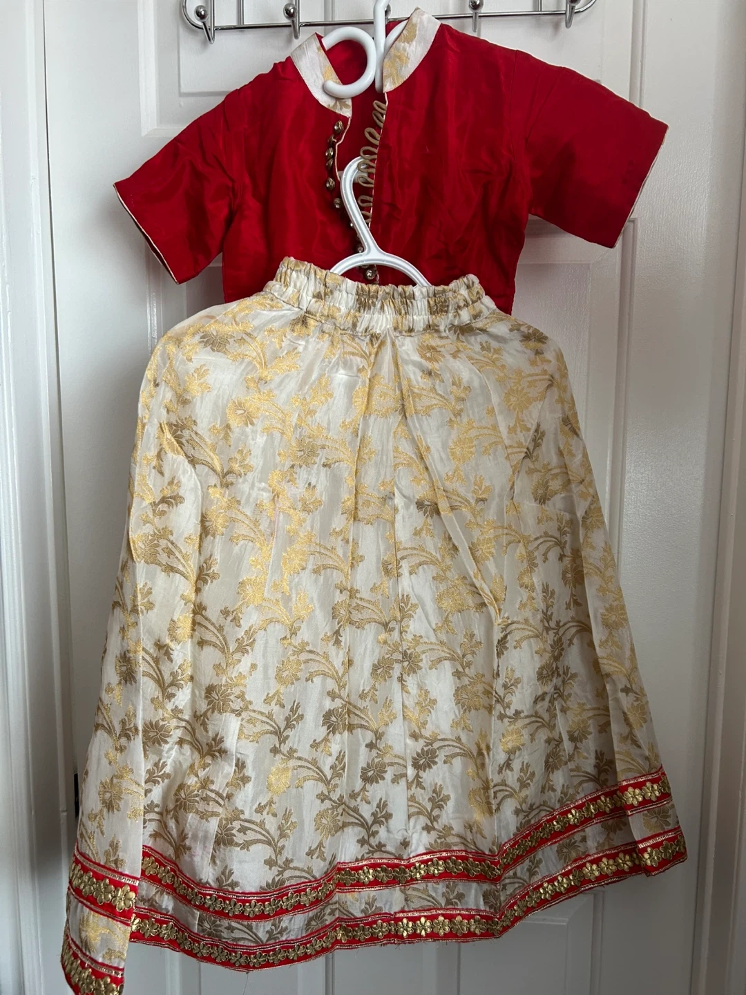 A beautiful red blouse and lehenga skirt set! The blouse is a vibrant red with short sleeves and decorative buttons. The skirt is a lovely off-white colour with gold floral patterns and a red and gold border. Perfect for a special occasion!
