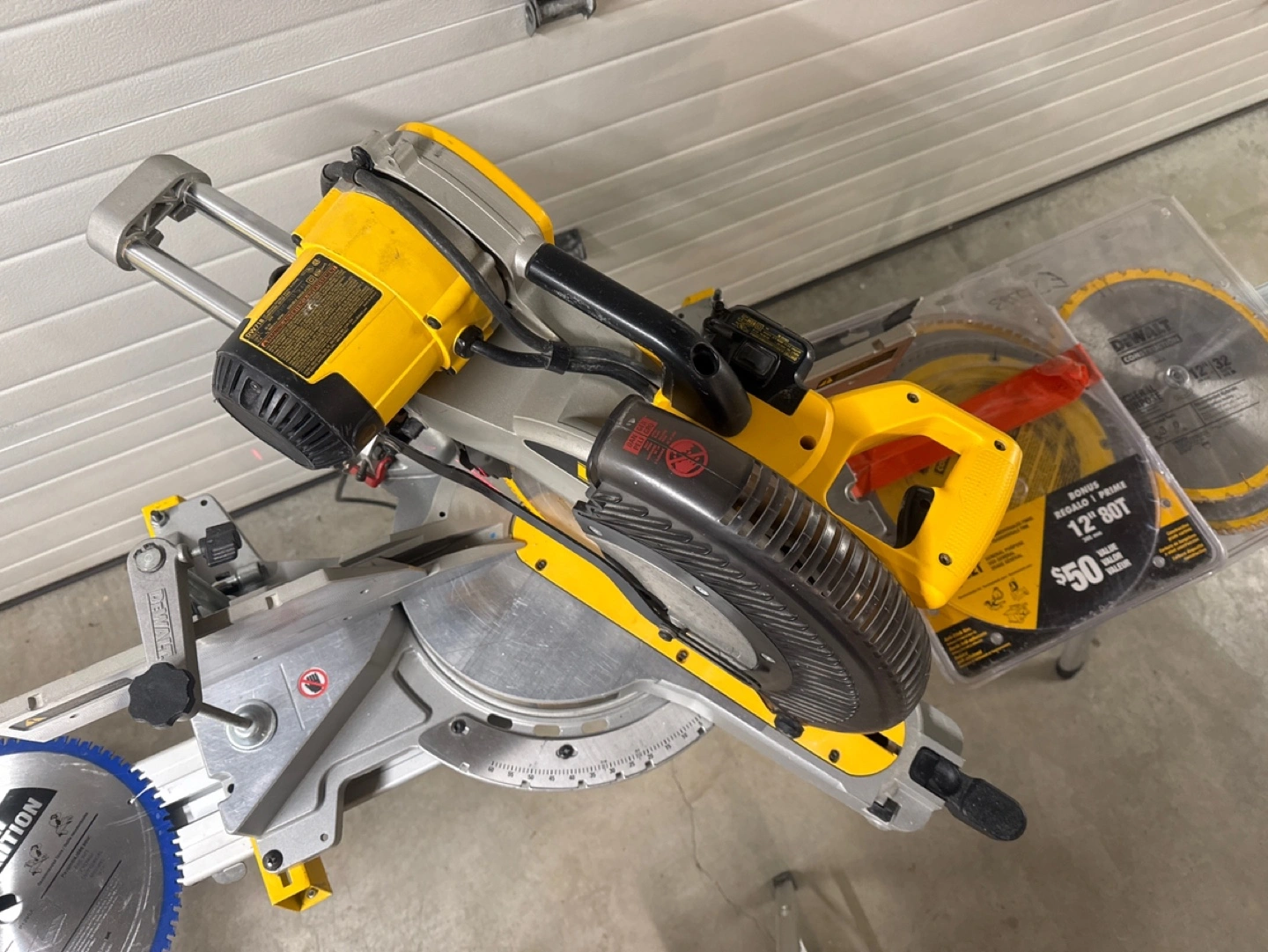 Dewalt 12” Double Bevel Sliding Compound Miter Saw with Stand, Laser, Mounting brackets and extra blades