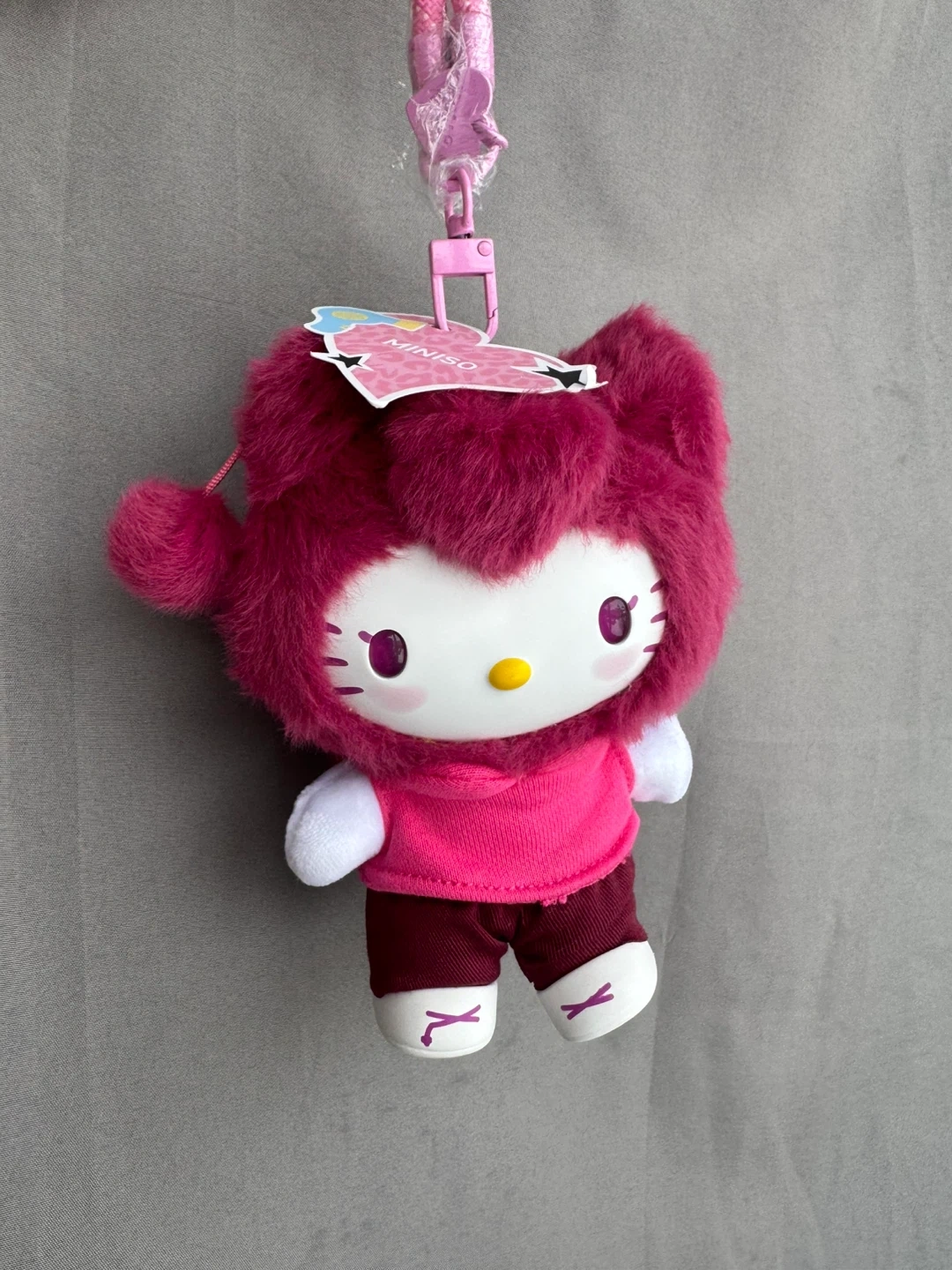 Super cute and fluffy pink Hello Kitty plush charm from MINISO's "Pop Star" collection. It's got a fuzzy pink wig, pink sweater, and maroon shorts. Comes with its original packaging and display card. Perfect for adding some flair to your bag or backpack!
