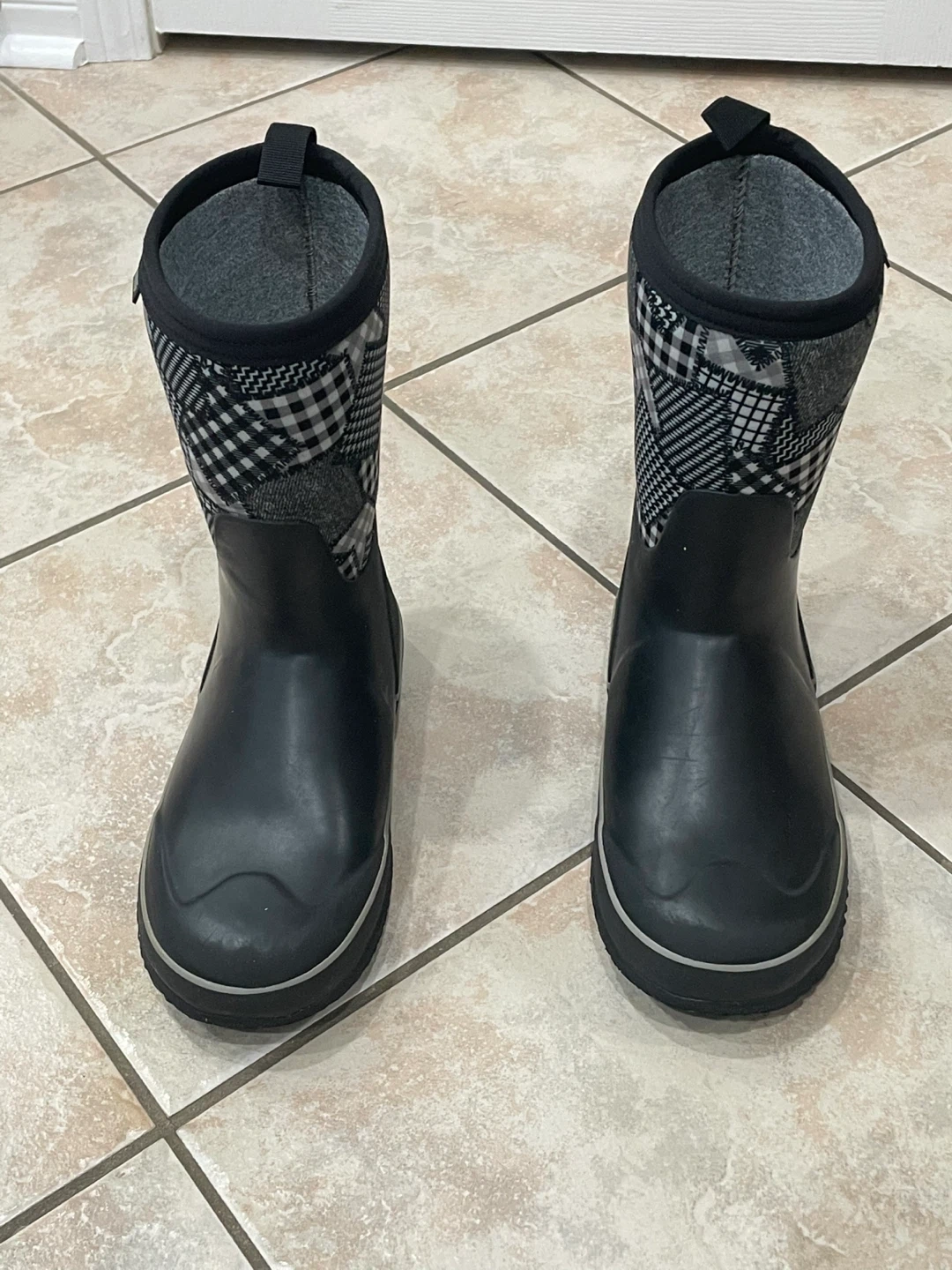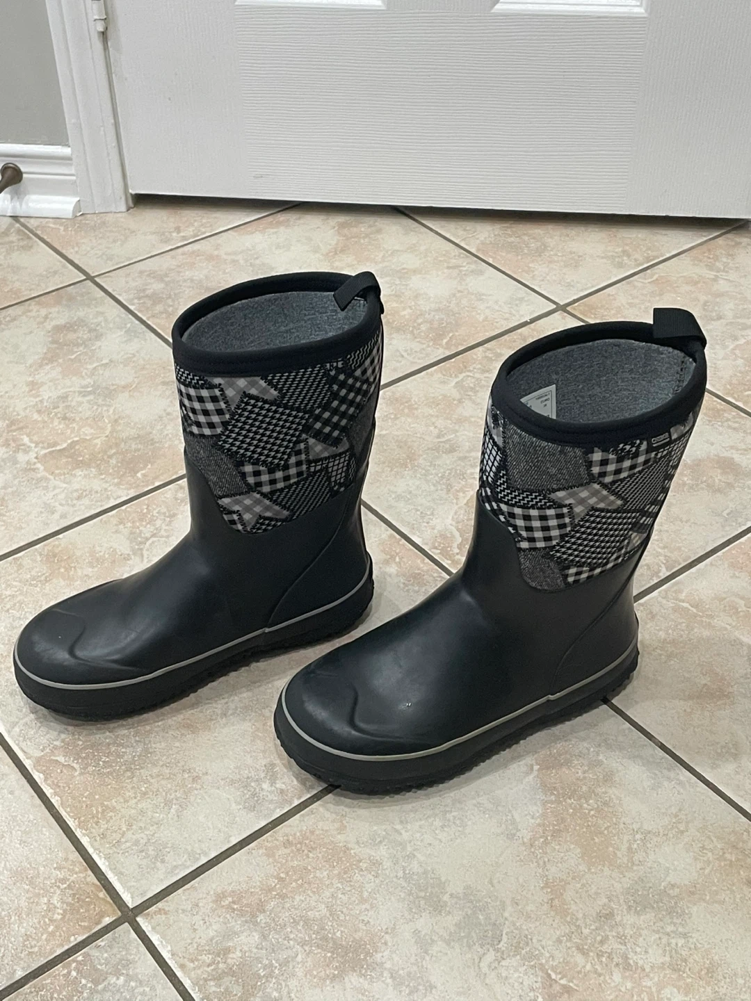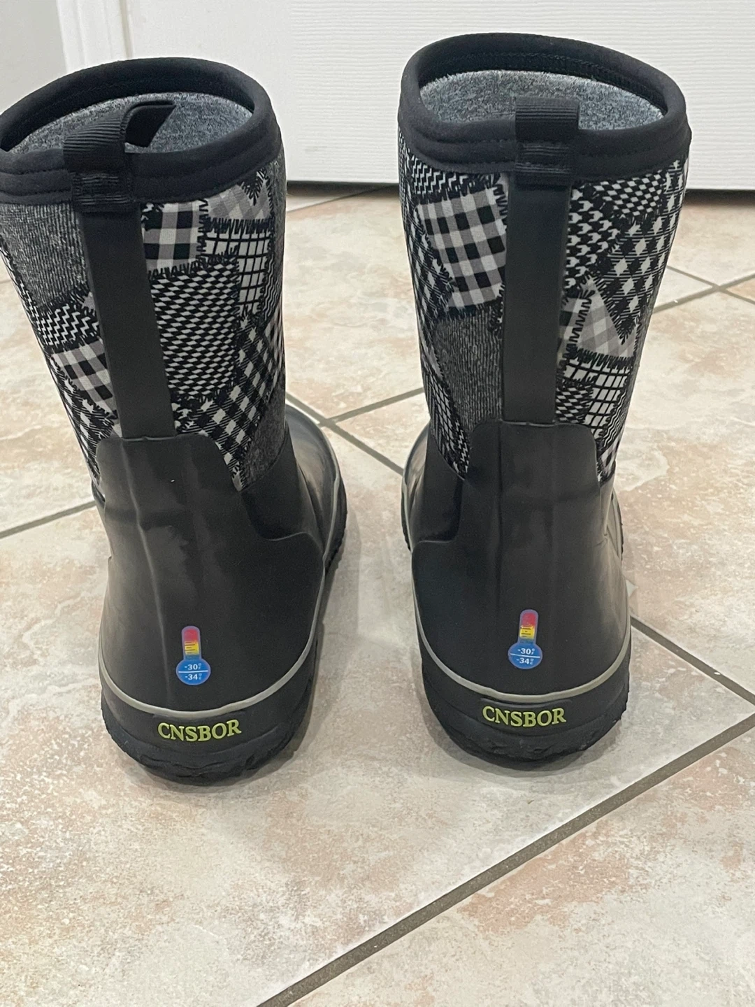 18Selling a pair of CNSBOR rain boots in size 5 .They are black with a checkered pattern around the top. Perfect for keeping little feet dry on rainy days!