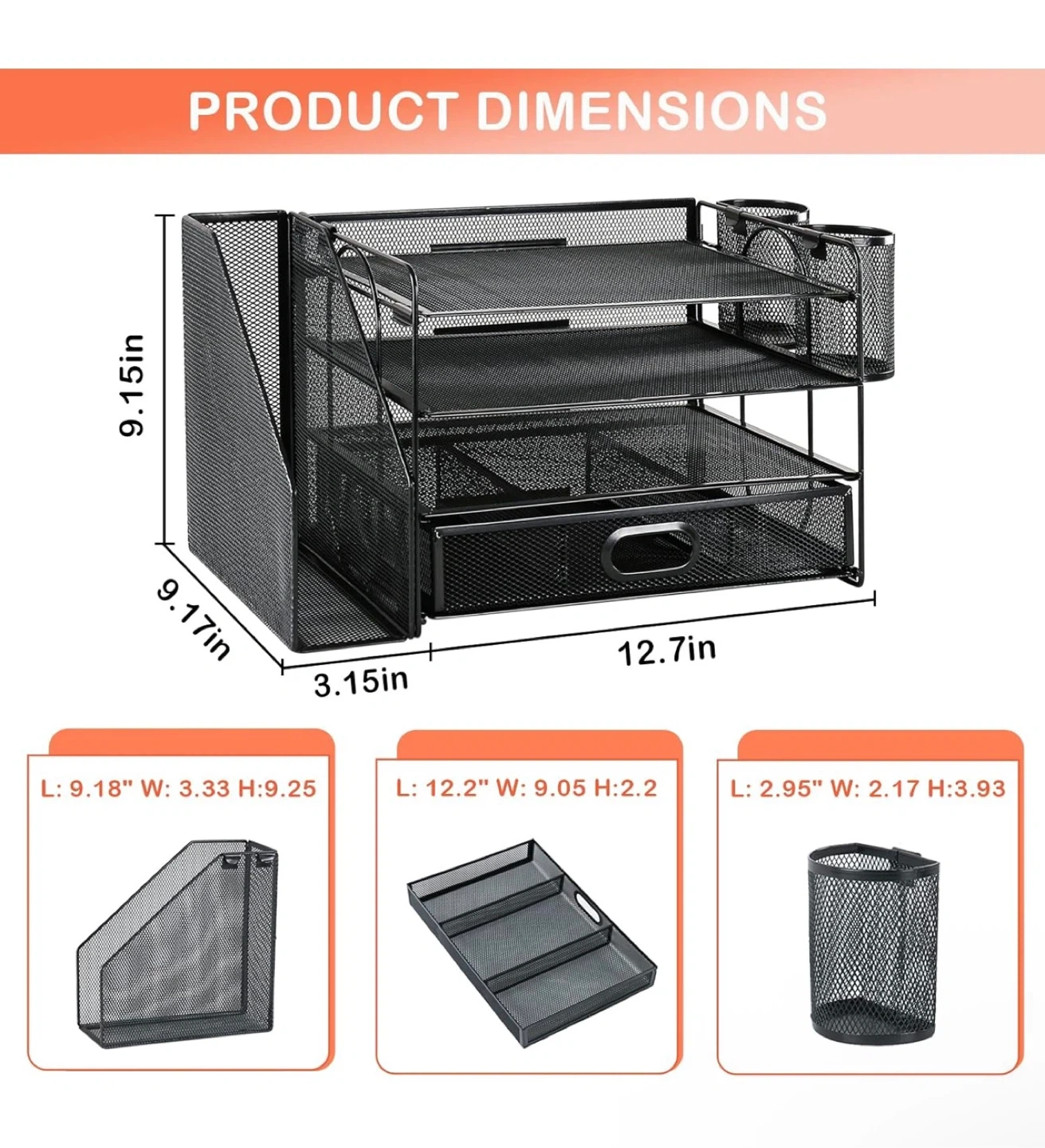 Declutter your workspace with this handy mesh desk organizer! It features multiple tiers and a drawer to keep all your supplies neatly organized.