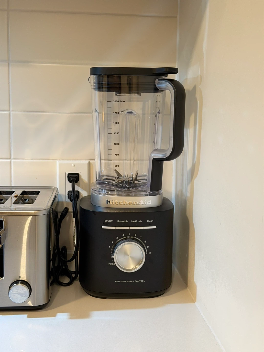 This KitchenAid blender features precision speed control with 10 settings, plus Pulse, Smoothie, Ice Crush, and Clean functions. It has a 2000 ml max capacity pitcher. This appliance is great for smoothies and crushing ice!