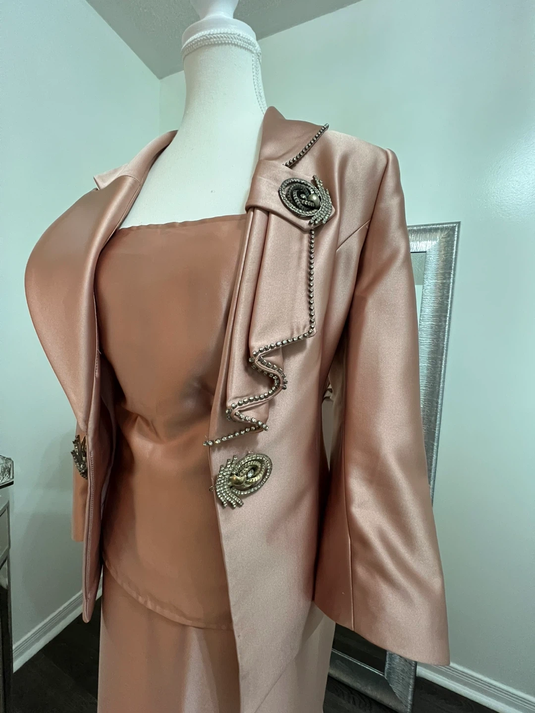 Women's 3-Piece Rose Gold Satin Skirt Suit with Embellishments