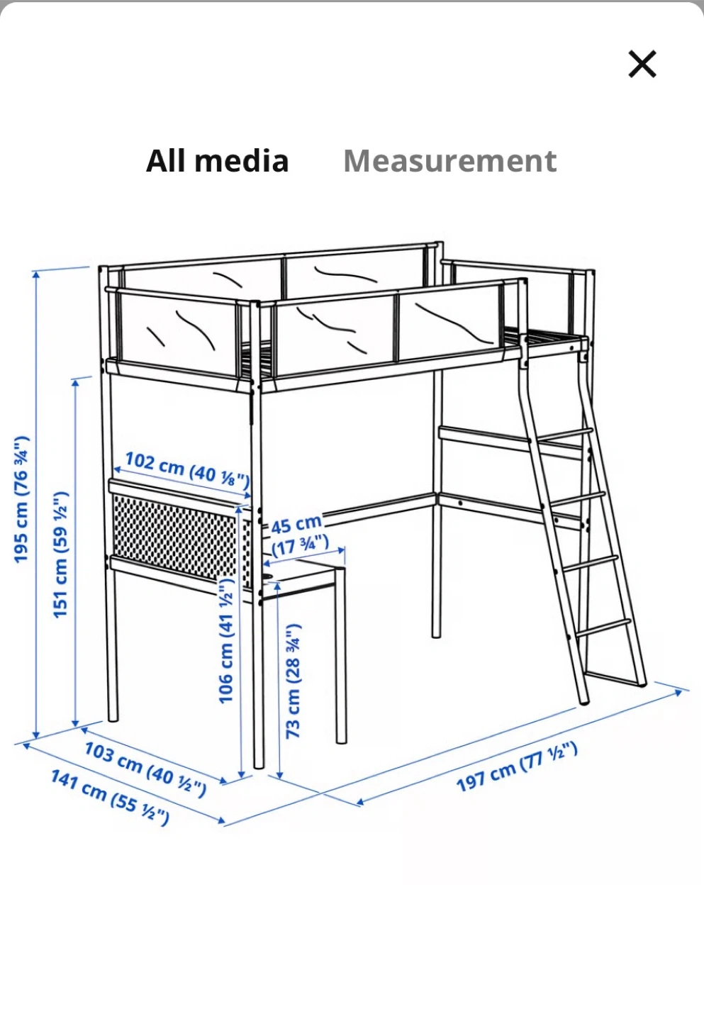 This is an IKEA loft bed featuring a built-in desk and a ladder for easy access. It's white and includes the desk surface and railings. The total height is 195 cm and the length is 197 cm.