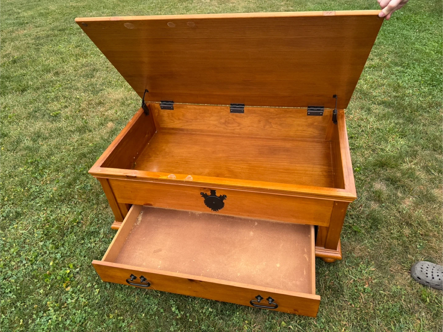 This is a lovely wooden storage chest. It has a drawer and a hinged top for ample storage. The chest is in good condition and would be a great addition to any room