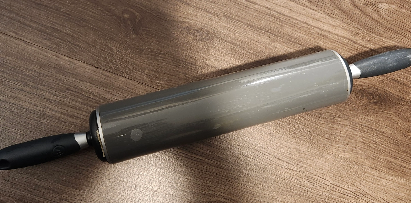 🥕I'm selling a grey rolling pin. It's about 17 inches long. It has black handles and a smooth surface for easy rolling. A great addition to your baking tools!