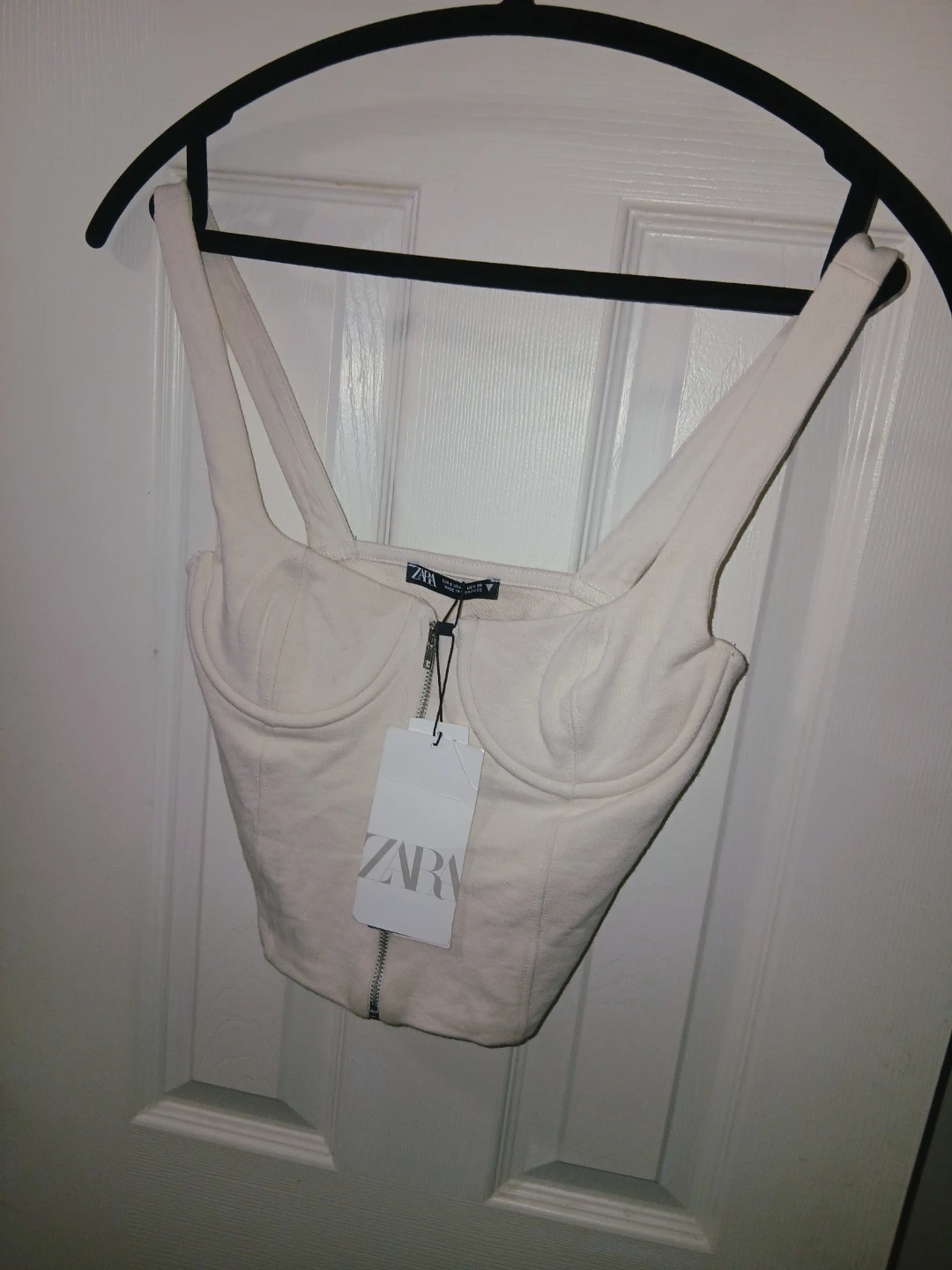 Cream-coloured corset top from ZARA. It features a zippered front and a fitted silhouette.
