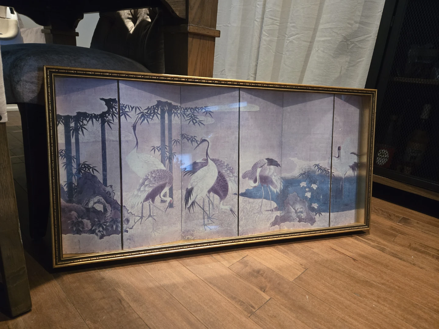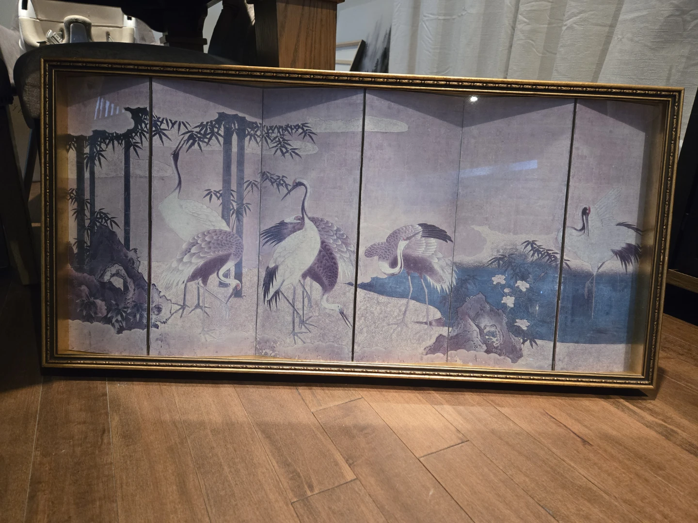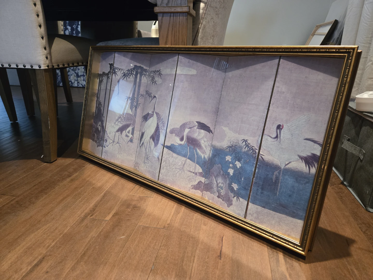 Elevate your space with this professionally framed Asian inspired art panel featuring a lovely crane design. It has a solid, brass, gold-tone frame and would look great in any room! (36" x 17.5")