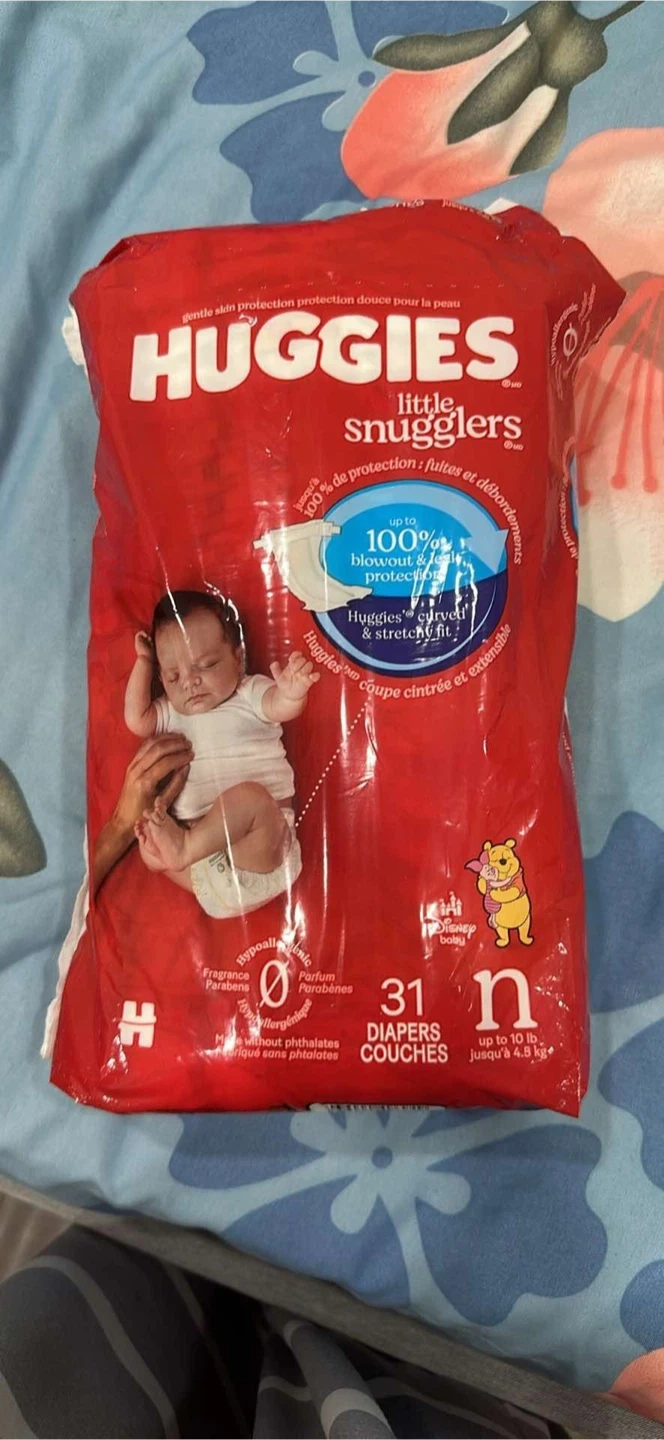 Huggies Little Snugglers diapers. Gentle skin protection for baby's comfort. Hypoallergenic and free of fragrances and parabens. Suitable for babies up to 10 lbs.
