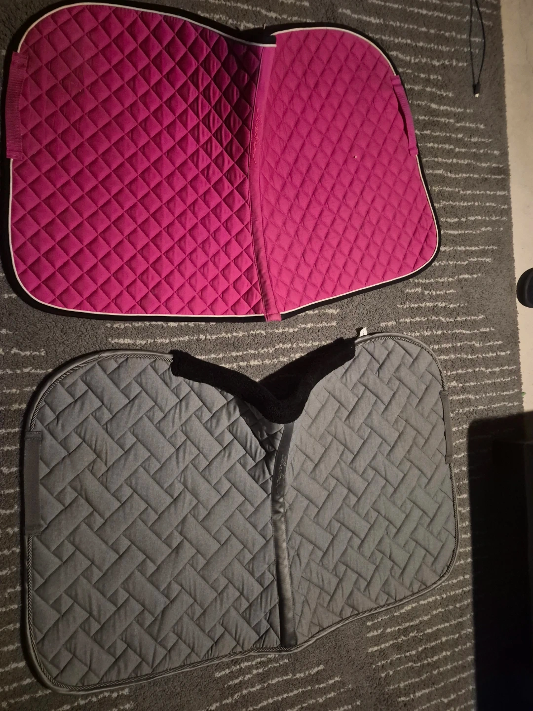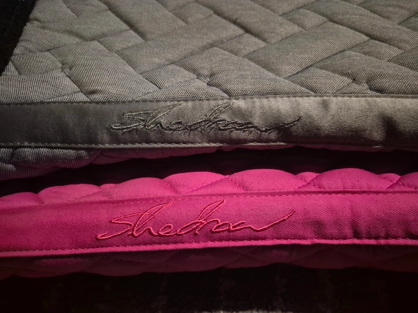 Two quilted saddle pads, one in bright pink and one in grey. Both have "Shedrow" embroidered on the trim. They're made with a diamond pattern on the pink one and a woven pattern on the grey one. These are saddle pads for horses.