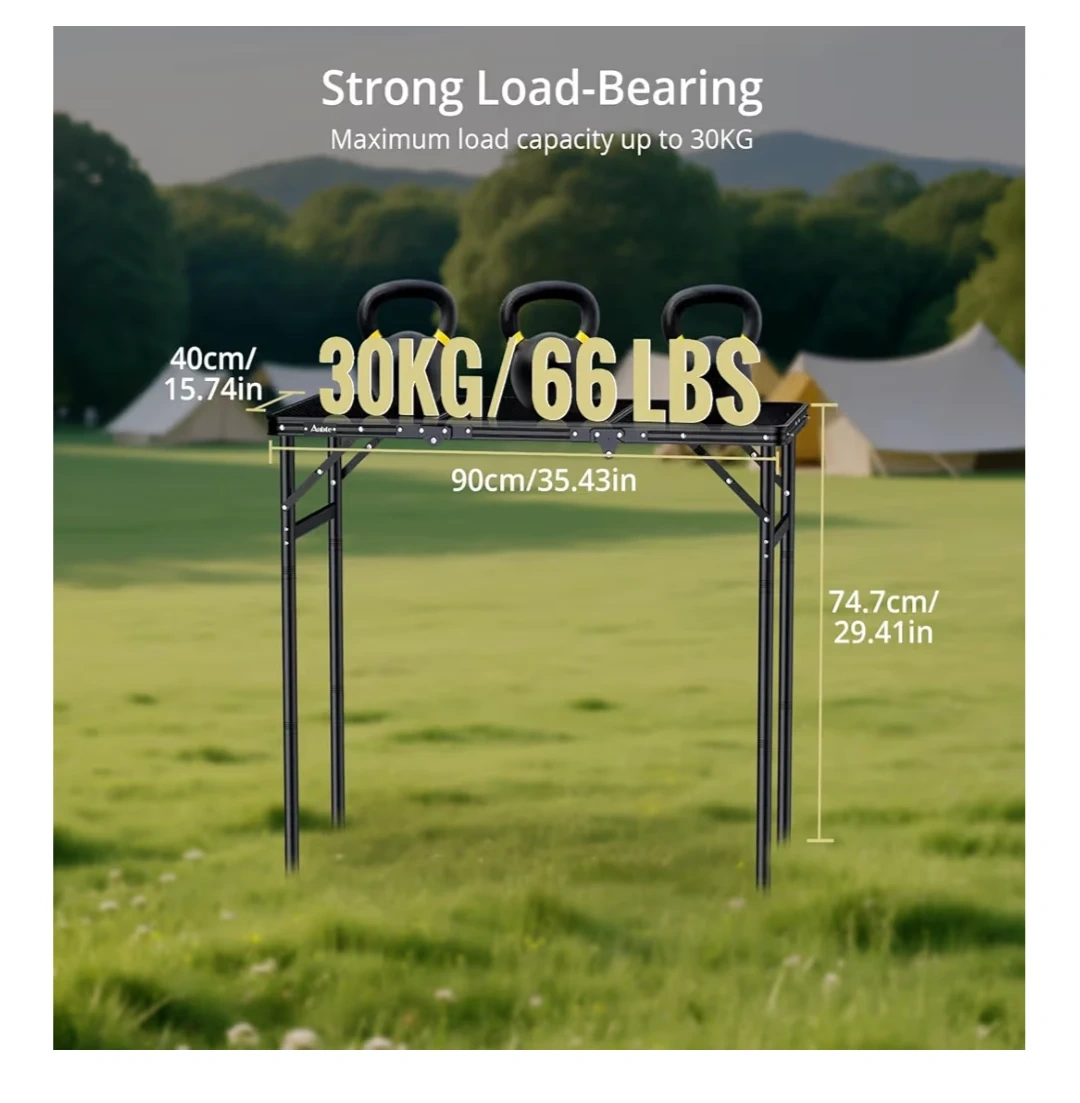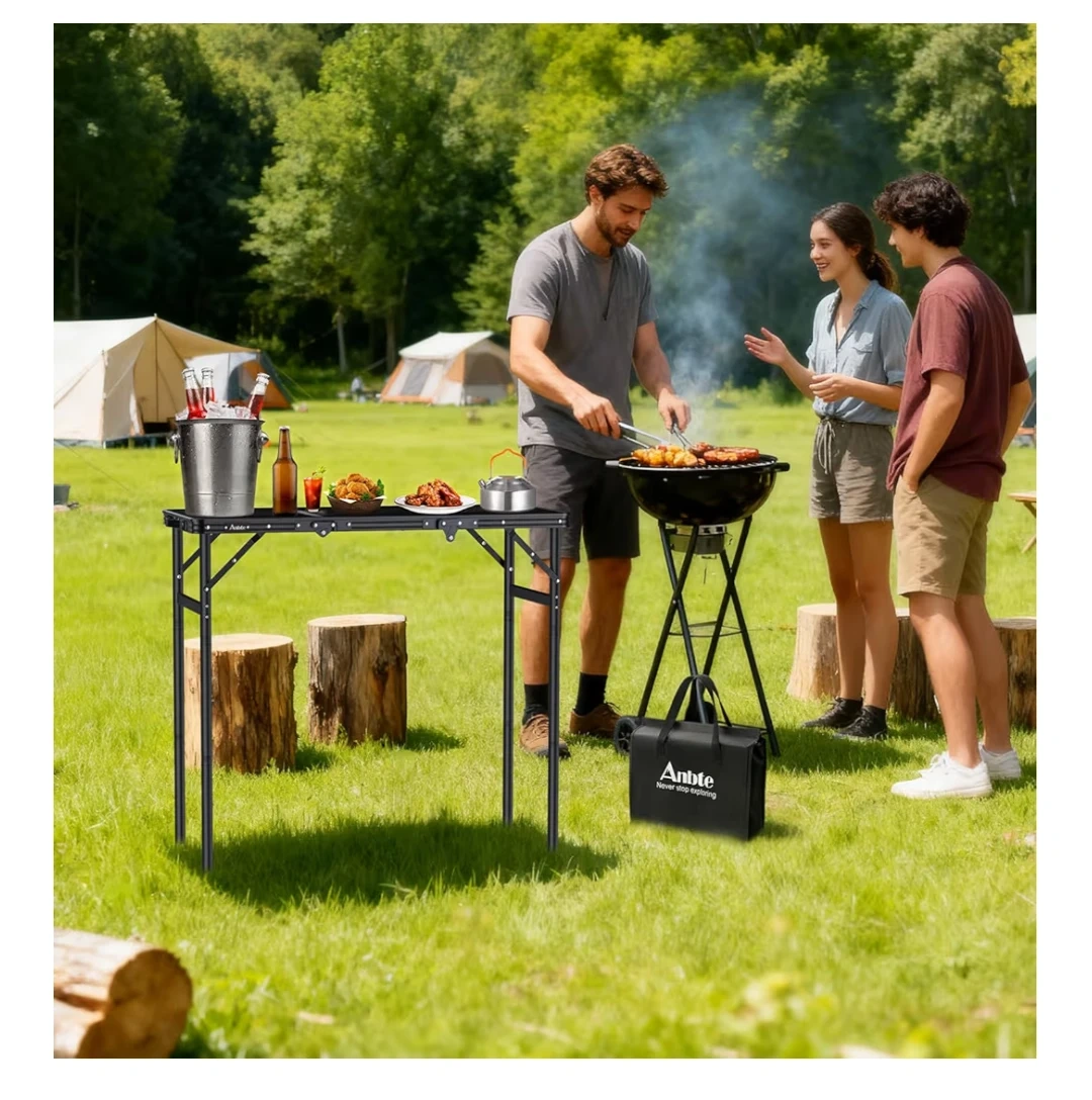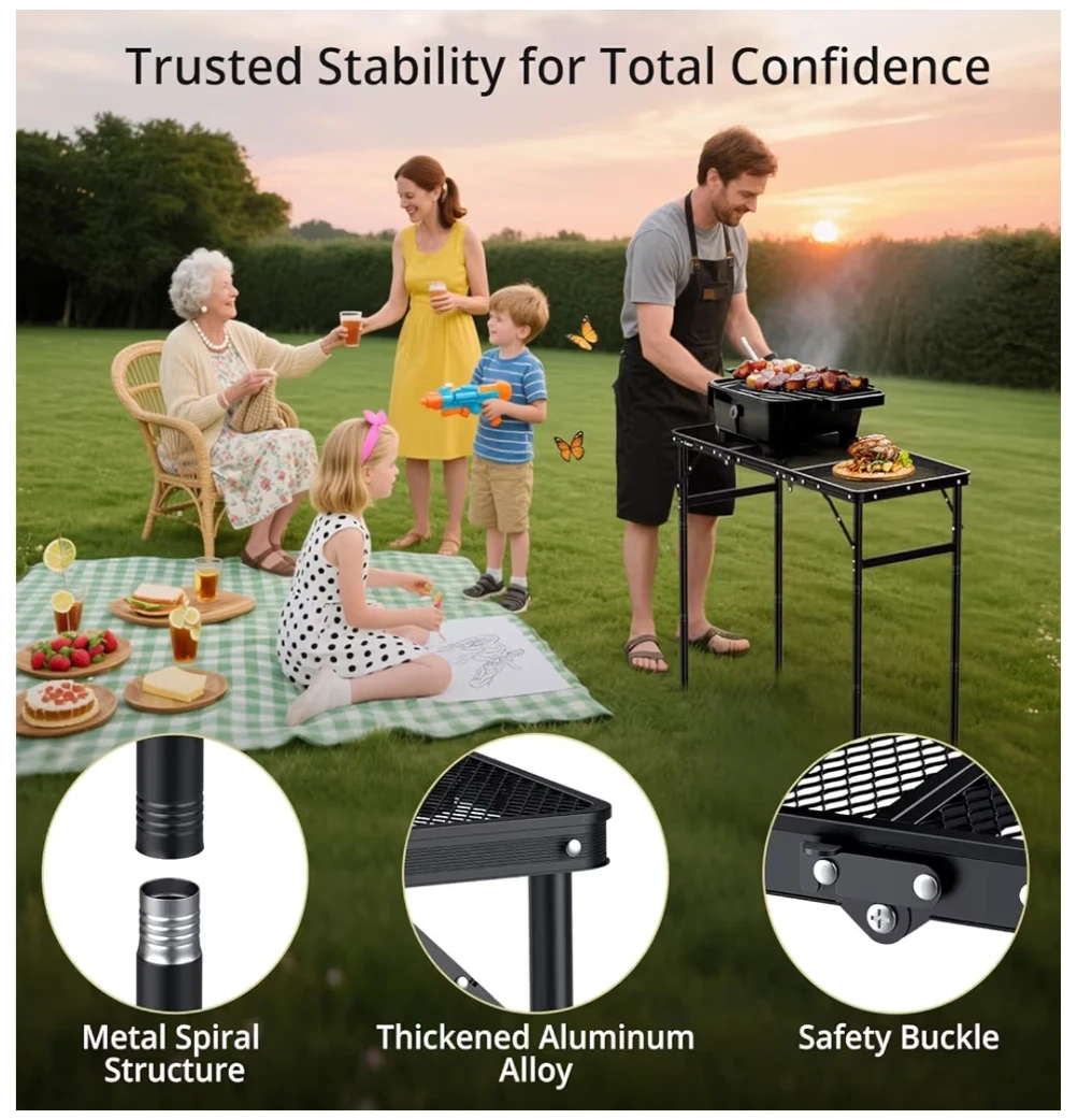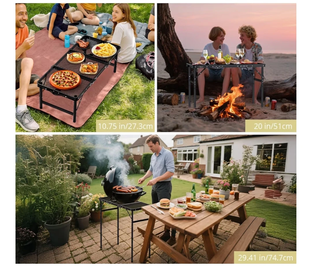 This is a black, tri-fold grill table. It's made with an iron mesh tabletop that's heat resistant and easy to clean. It has 3 adjustable heights and a maximum load capacity of 30KG. Includes a portable storage bag.