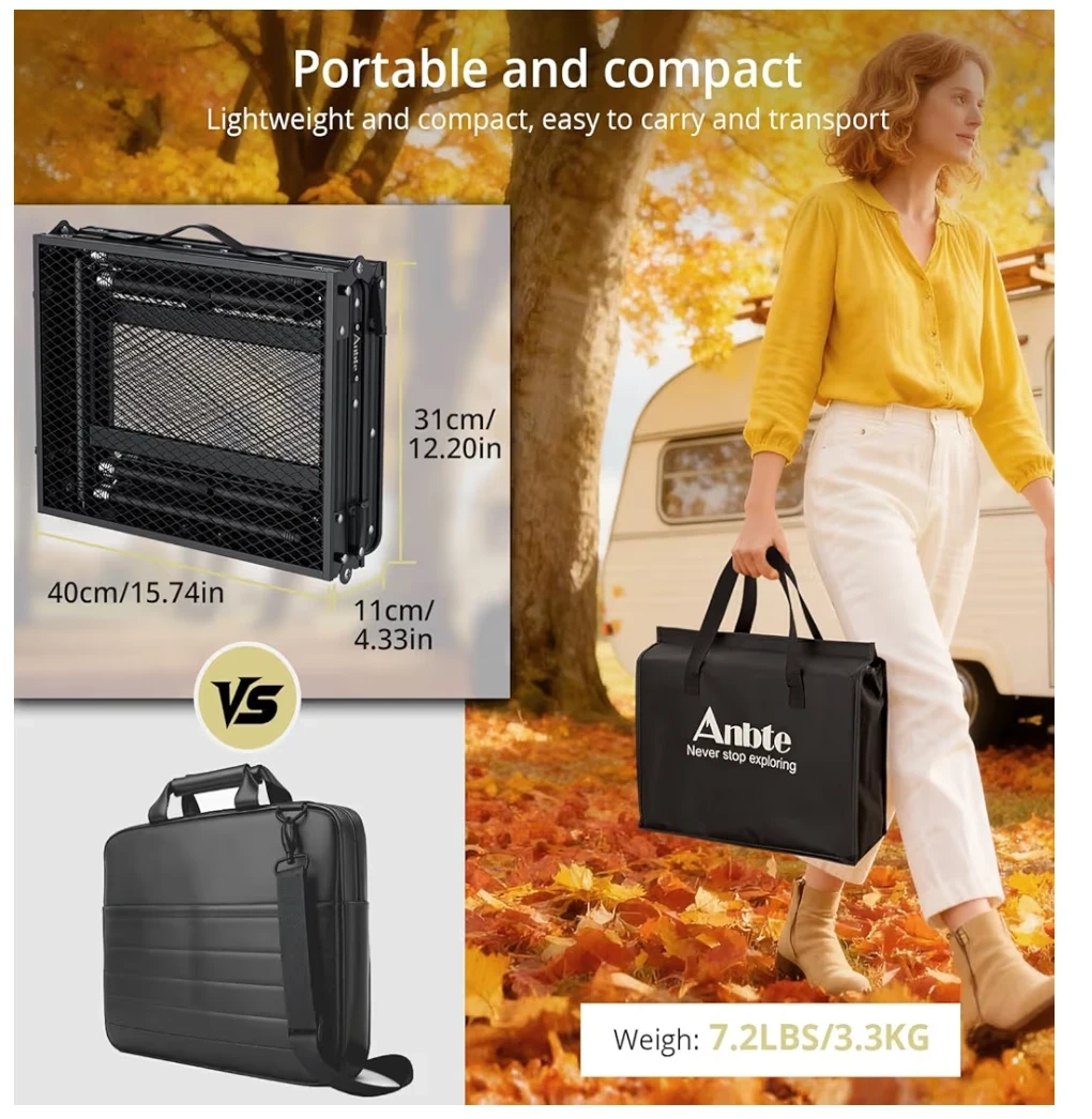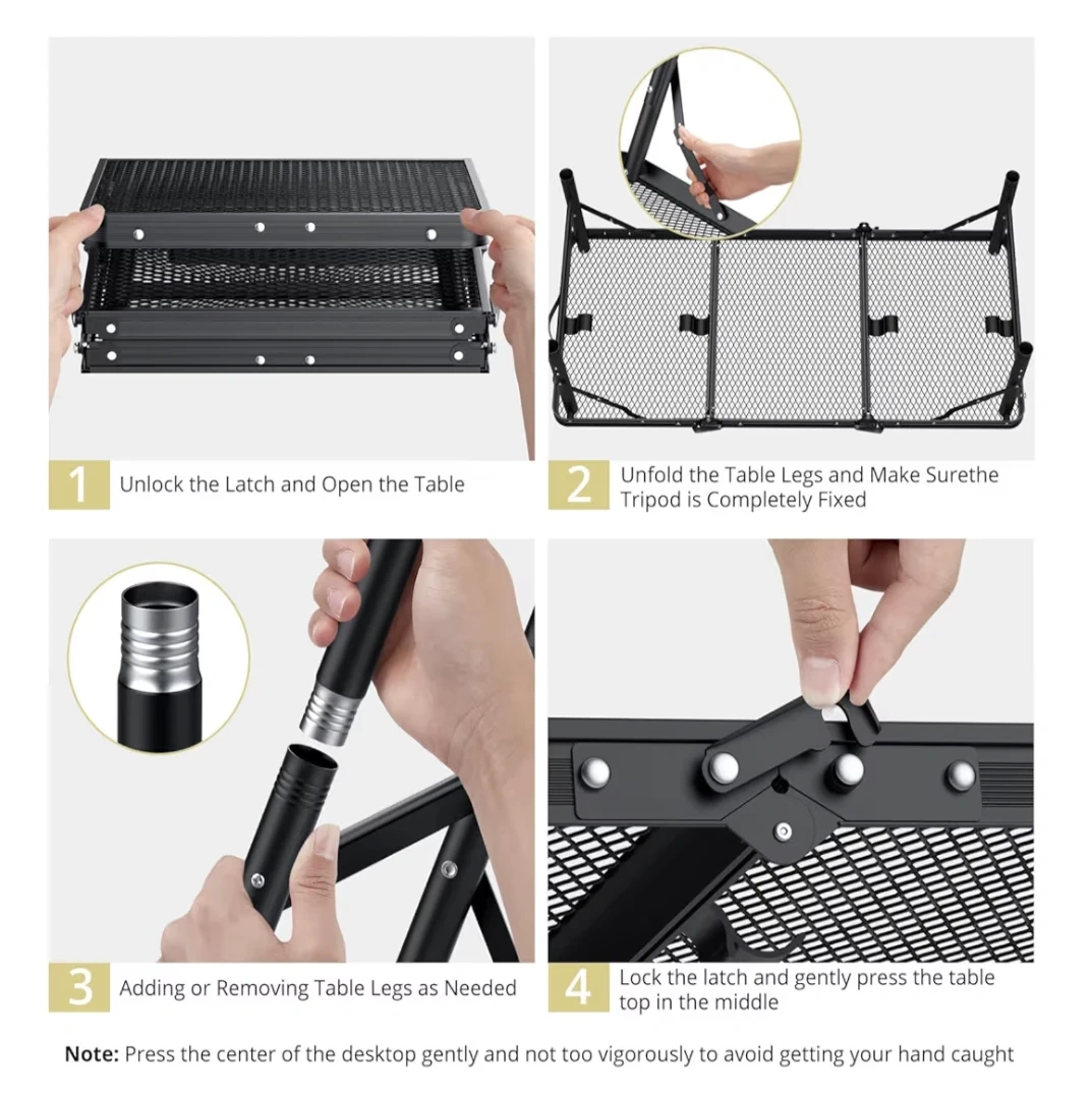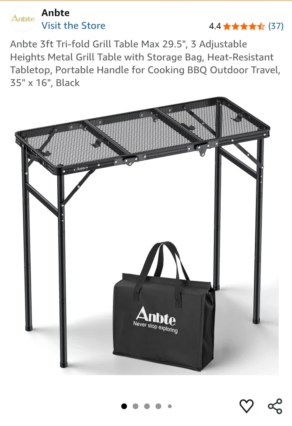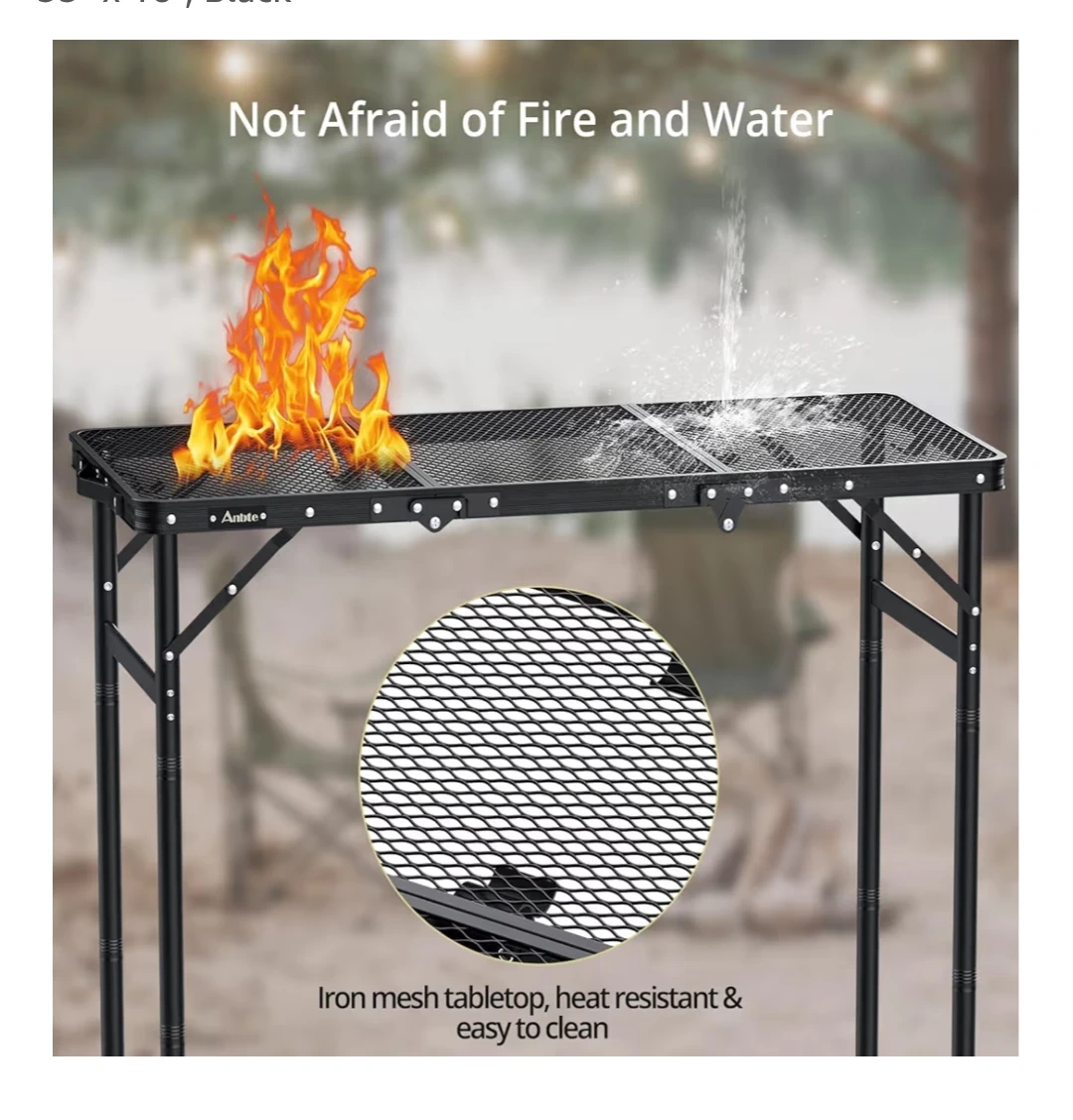This is a black, tri-fold grill table. It's made with an iron mesh tabletop that's heat resistant and easy to clean. It has 3 adjustable heights and a maximum load capacity of 30KG. Includes a portable storage bag.