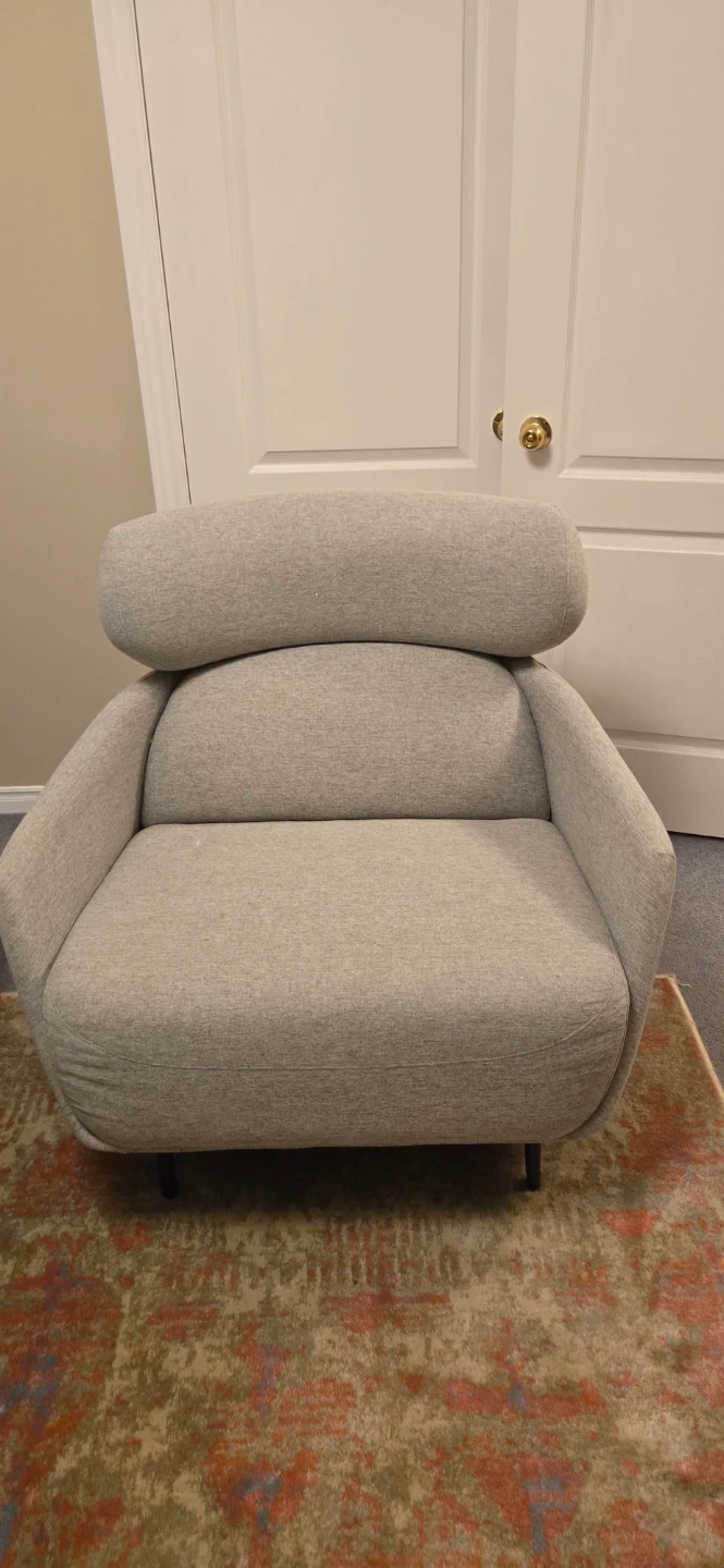 Comfortable armchair upholstered in a light grey fabric. It has a rounded shape with a supportive high back and a unique headrest. Perfect for a living room or reading nook!