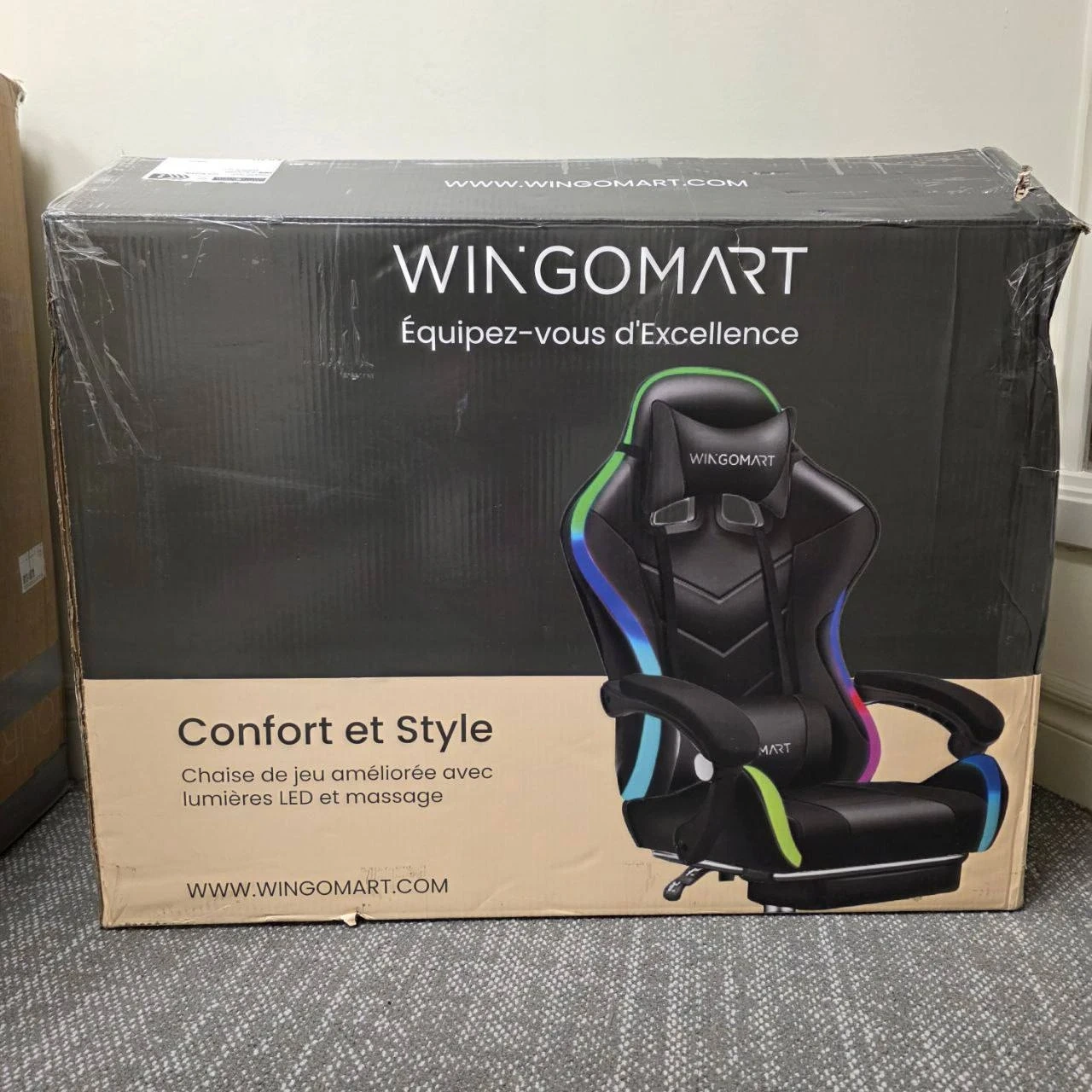 Brand new Wingomart ergonomic gaming chair with footrest. High back faux leather design with RGB LED lights, adjustable armrests, and height-adjustable swivel. Comfortable and stylish, perfect for gaming or home office setup.