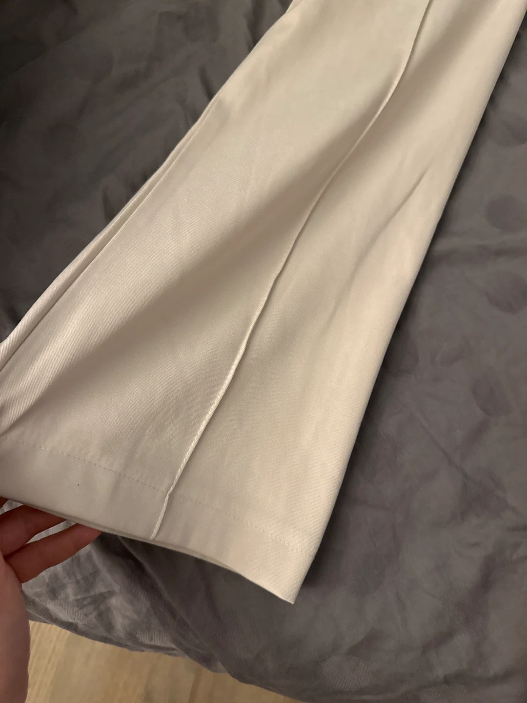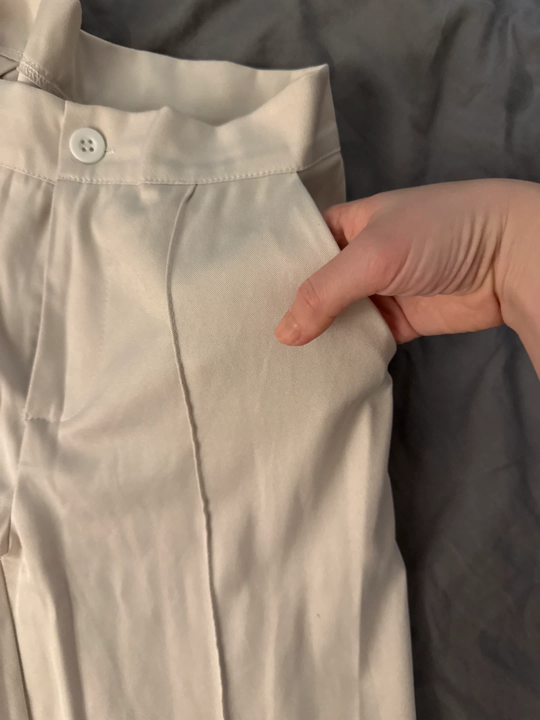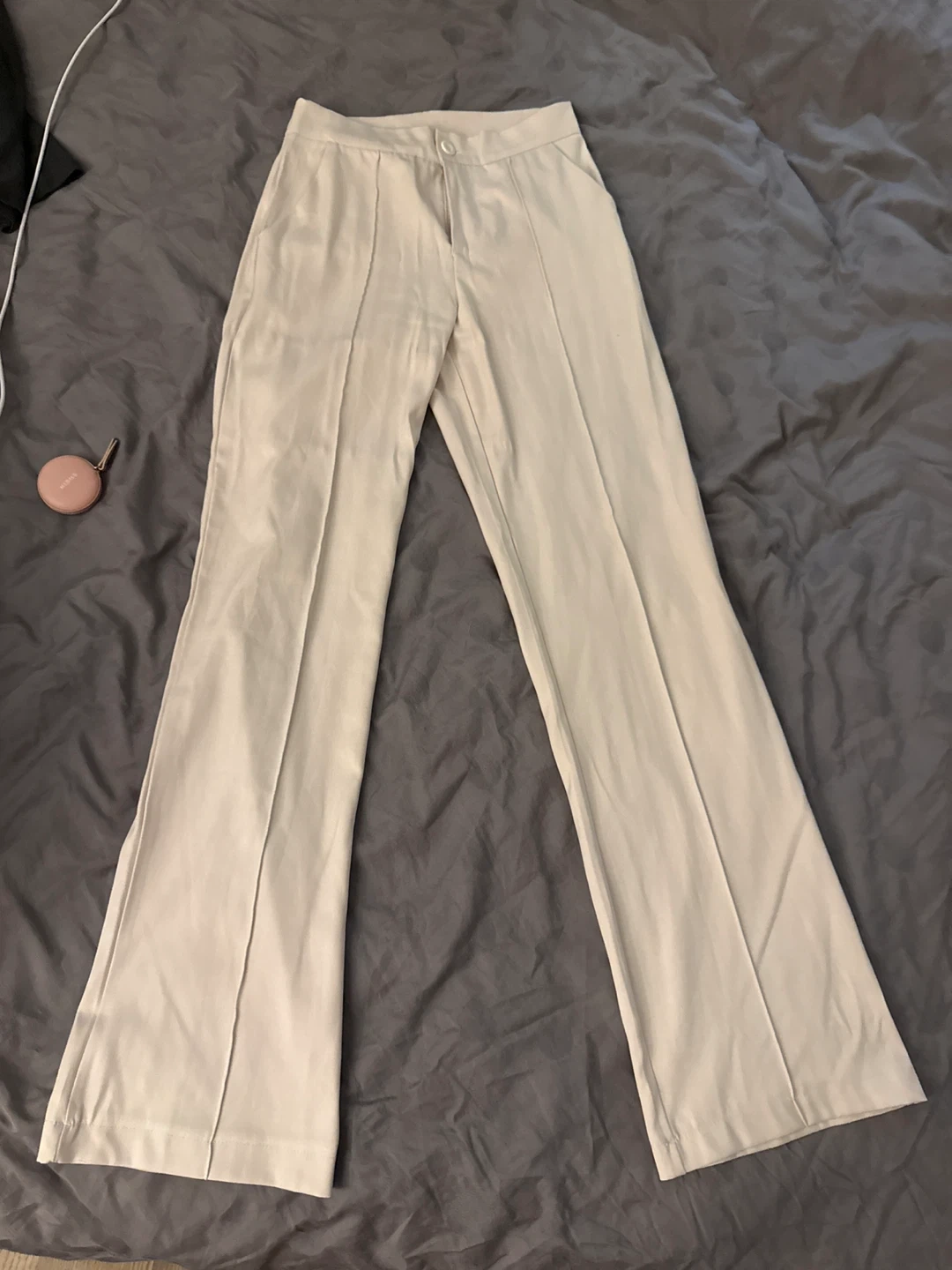 These beige trousers feature a flared leg design. They have a classic button and zipper closure. The material is a smooth, light fabric.