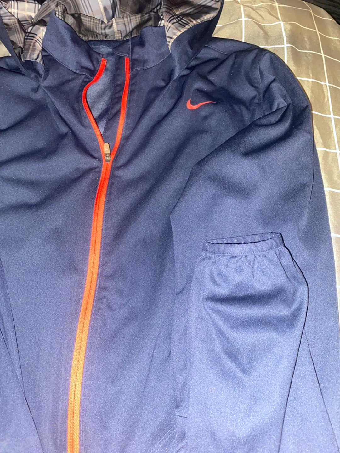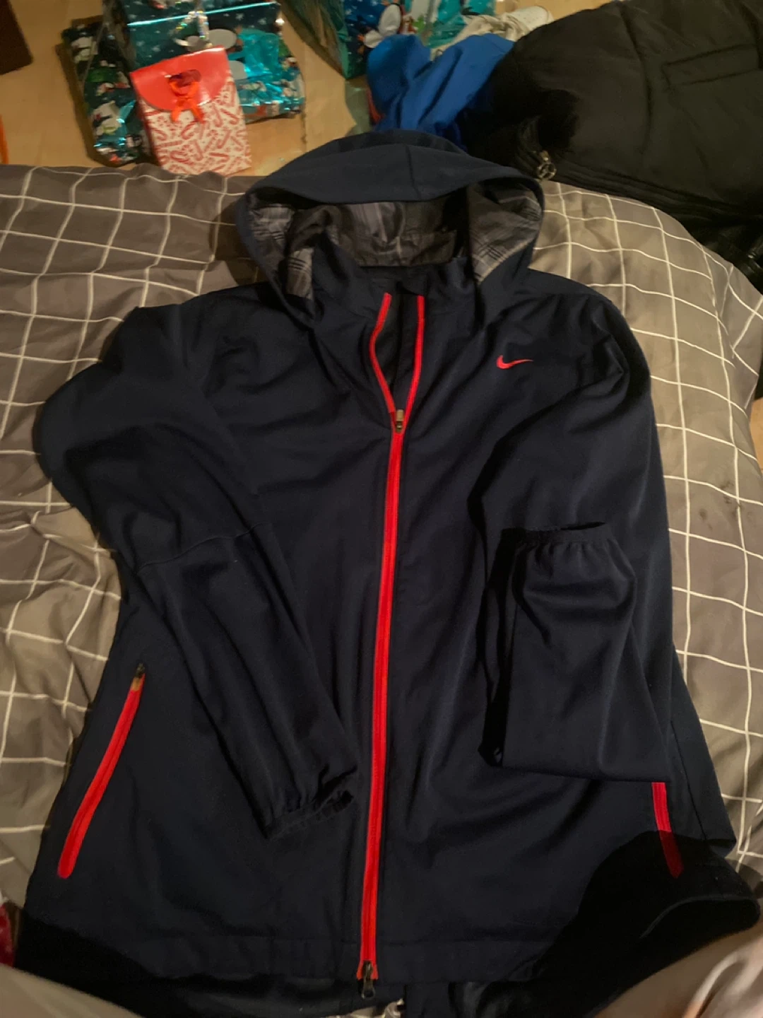 Selling a Nike jacket in navy blue with red zipper and accents. It's a full zip jacket with a hood. Great for layering or wearing on its own!