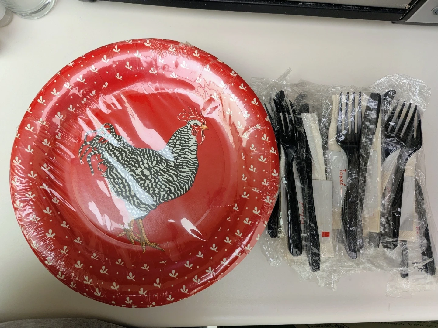 3 packs 10" red paper plates featuring a farmhouse-style rooster design (10 counts in each) including some disposable utensils.
