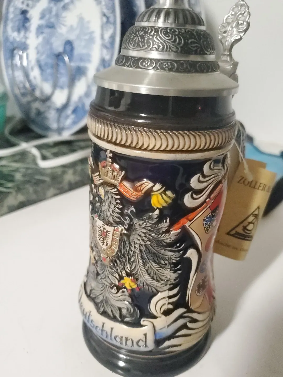 This is a Zollers German beer stein featuring intricate designs. It's made of ceramic with a pewter lid. The stein depicts the "Deutschland" coat of arms and other heraldic symbols. It's a substantial piece with a classic design.
