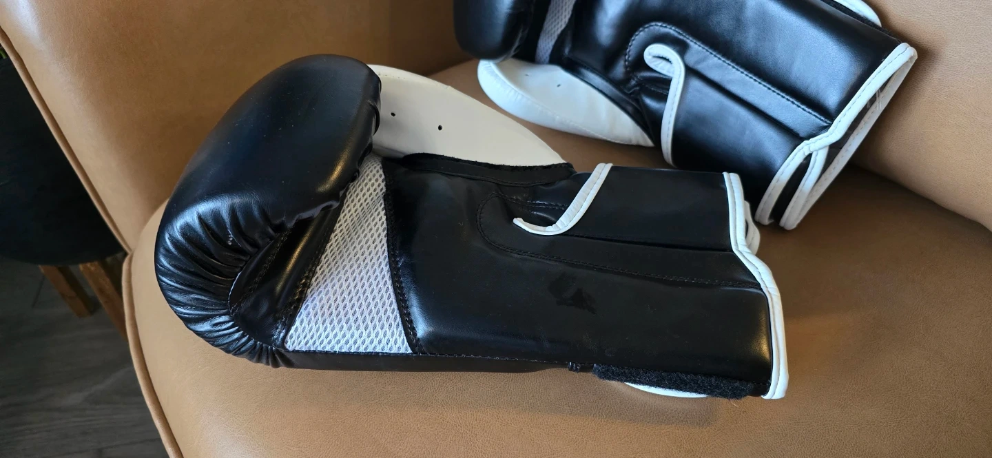 Black and white 9Round boxing gloves. These gloves are designed for training and sparring. They feature a secure hook-and-loop closure for a snug fit. Great for kickboxing or boxing workouts!
