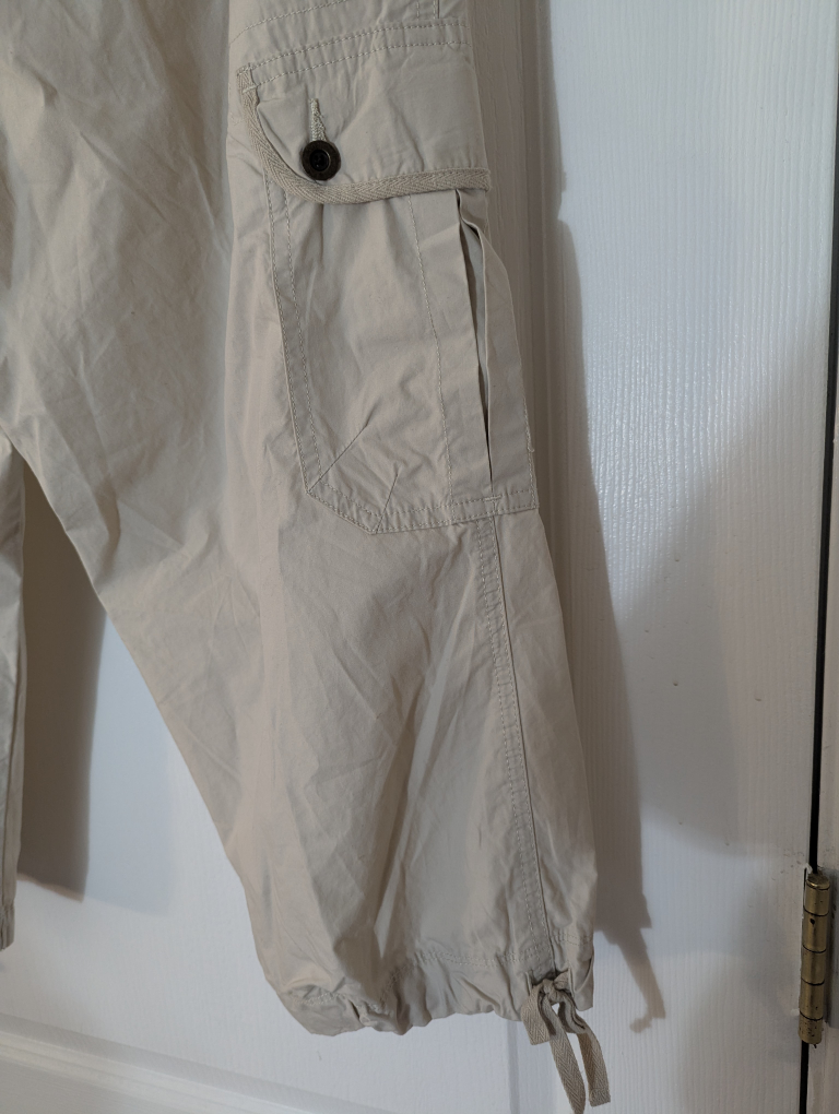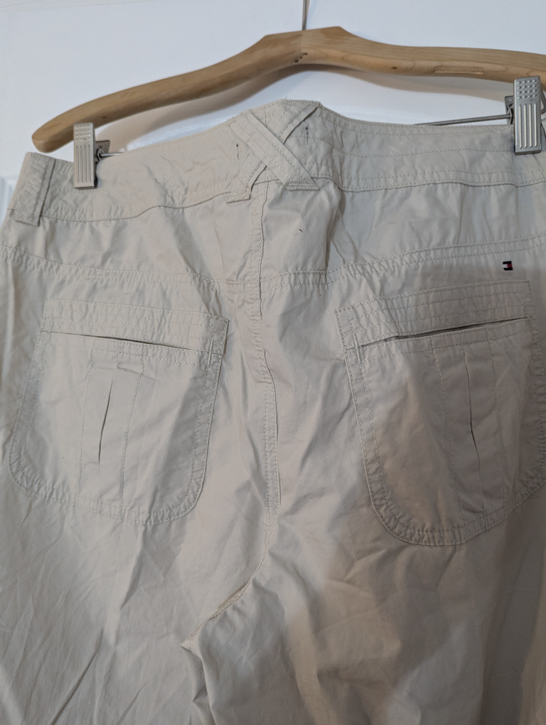 Tommy Hilfiger beige capri pants. These cargo pants are super comfy and stylish for everyday wear. They feature a classic cargo design with multiple pockets and a relaxed fit. Perfect for running errands or just lounging around!