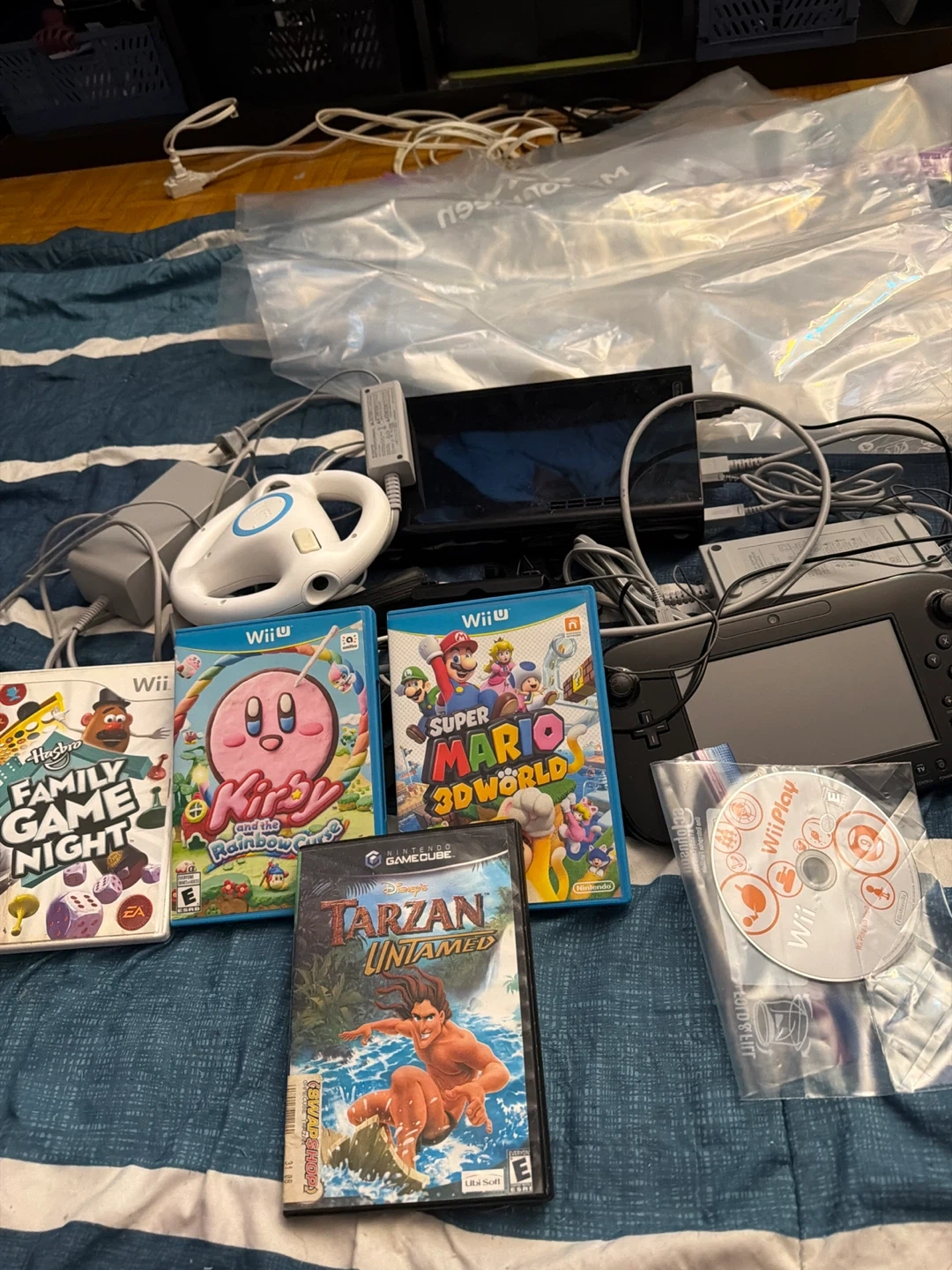 This bundle includes a Nintendo Wii U console, a steering wheel accessory, and four games: Family Game Night, Kirby and the Rainbow Curse, Super Mario 3D World, and Tarzan Untamed. It also comes with a Wii Play disc.