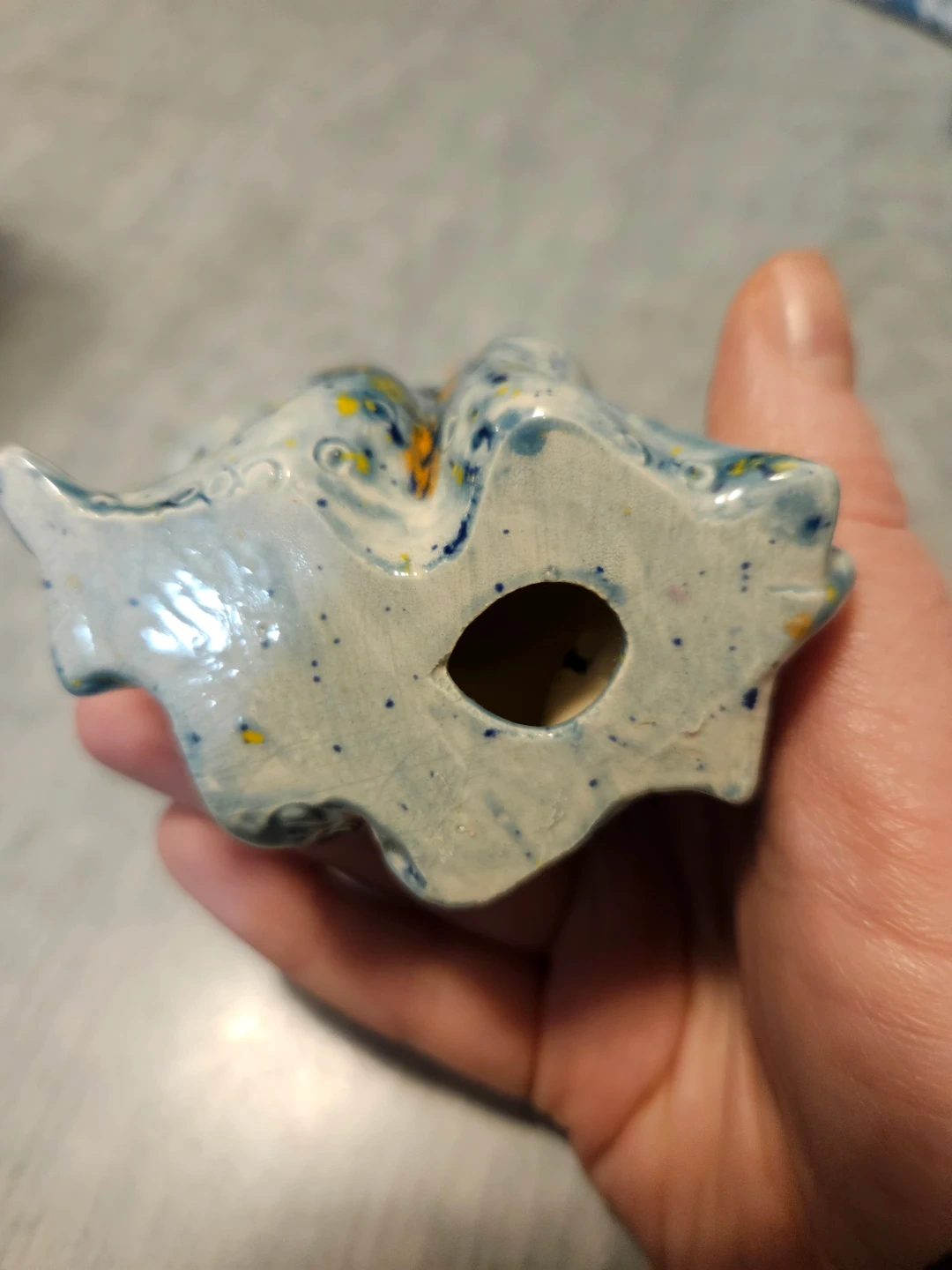 Cute ceramic octopus figurine with a colourful hat. It's a fun, quirky piece with a speckled blue glaze and yellow accents. The bottom has an opening, suggesting it could be used as a holder or planter.