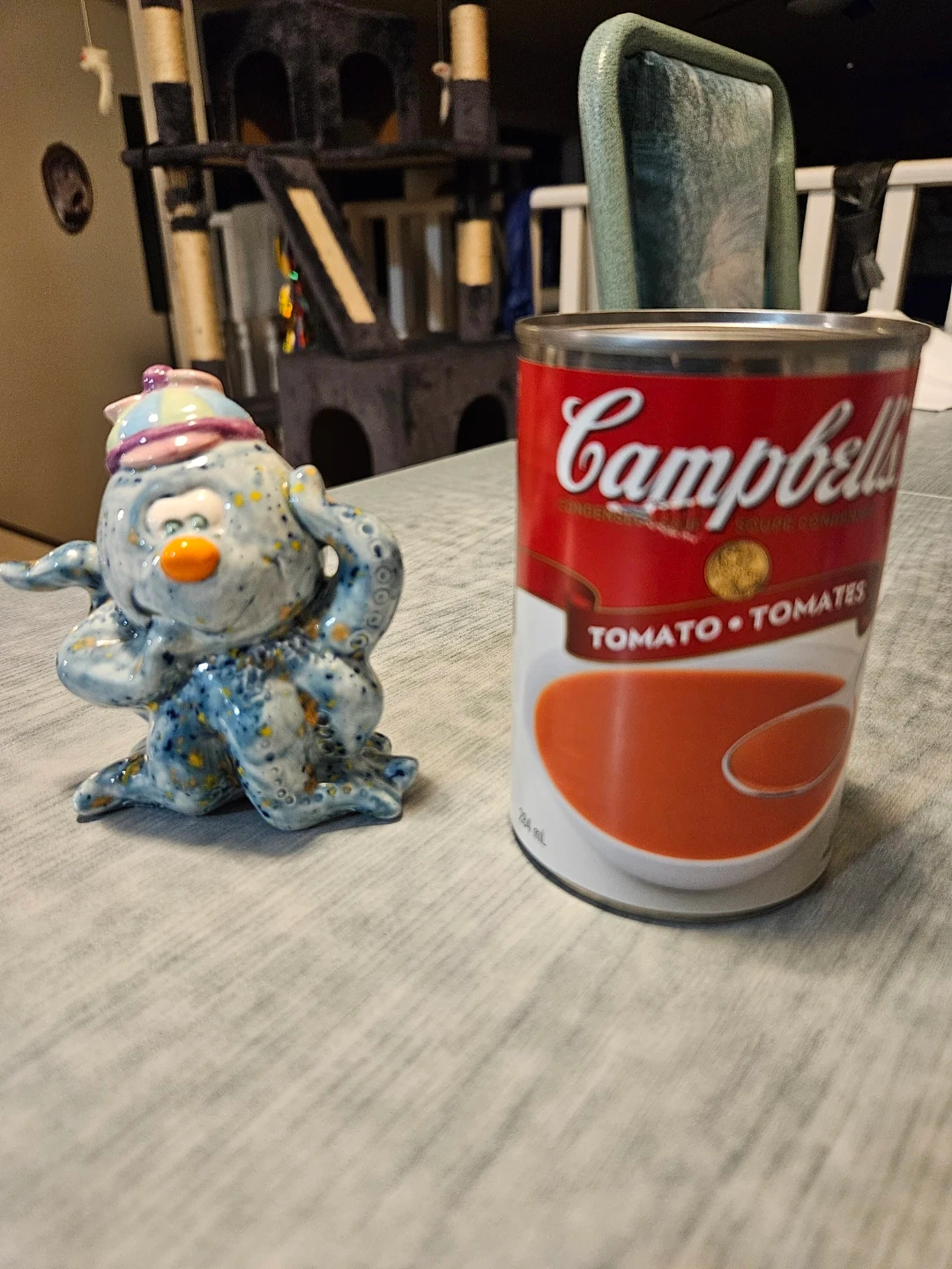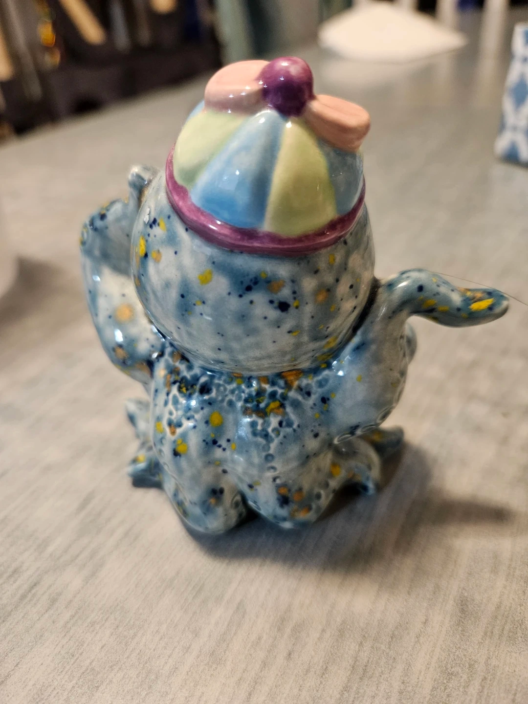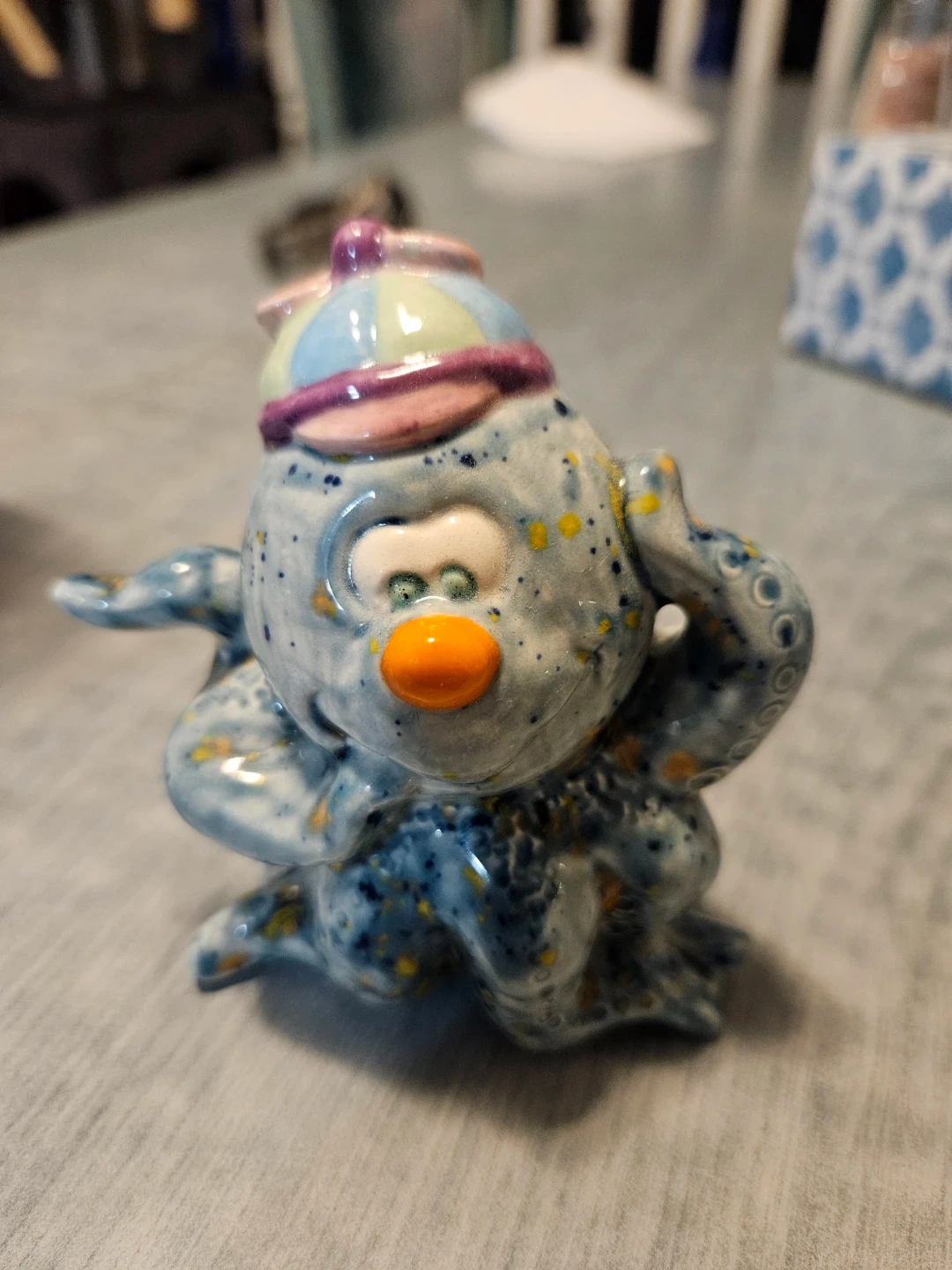 Cute ceramic octopus figurine with a colourful hat. It's a fun, quirky piece with a speckled blue glaze and yellow accents. The bottom has an opening, suggesting it could be used as a holder or planter.