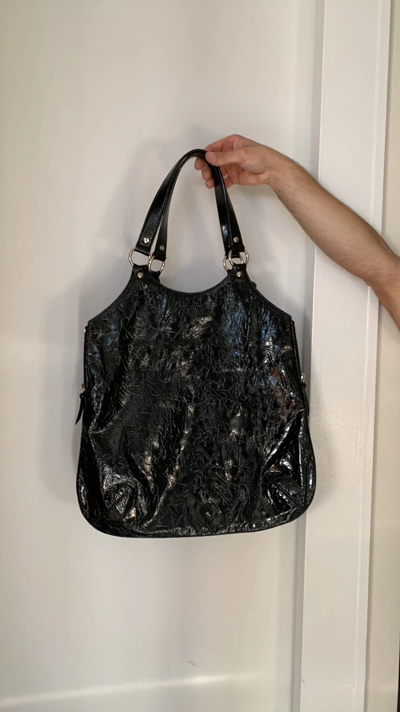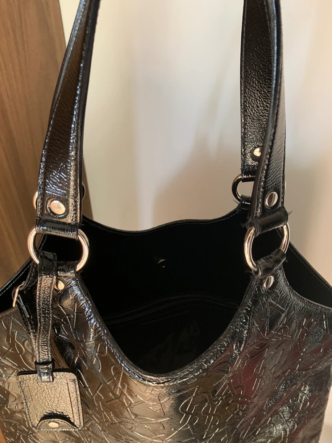 This is an Yves Saint Laurent black patent leather tote bag. It features a classic YSL logo pattern embossed on the exterior and a zippered closure. The interior has a zippered pocket and a fabric lining. Bag is a shoulder style with leather straps.