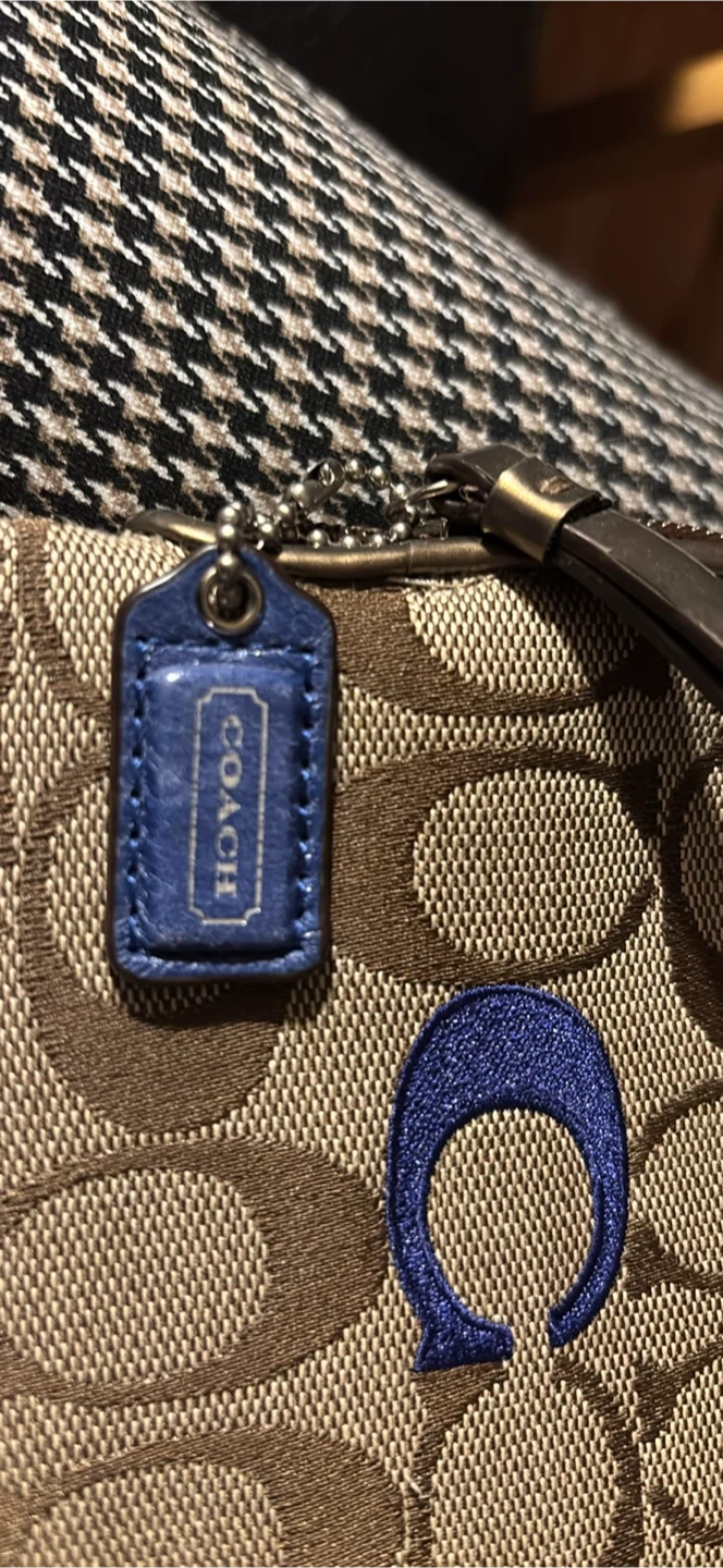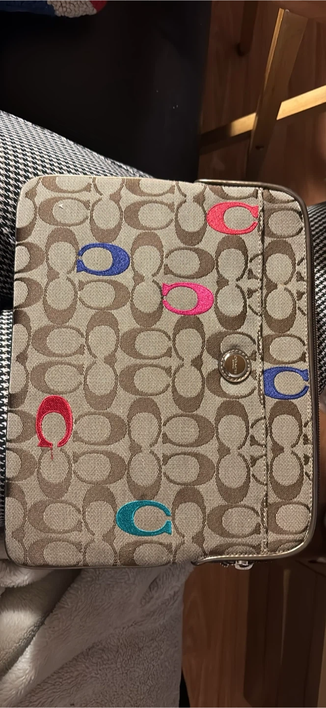 Selling a cute Coach iPad case in beige and brown. It has a colourful Coach logo design and a coral interior. Perfect for protecting your iPad in style!