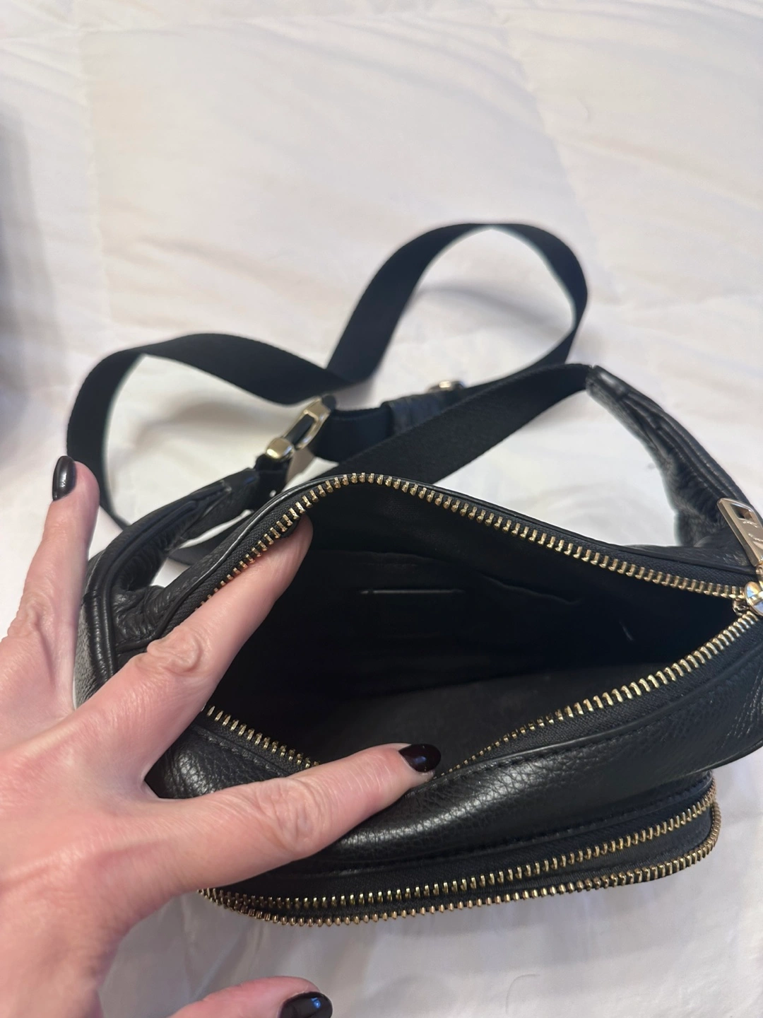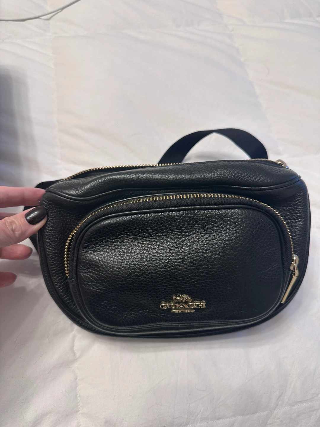 Selling a stylish black leather belt bag from Coach. It's in great condition and perfect for keeping your essentials close and secure. The bag features a main compartment and a front pocket, both with zippered closures. The adjustable belt strap ensures a comfortable fit. A great accessory for everyday use!