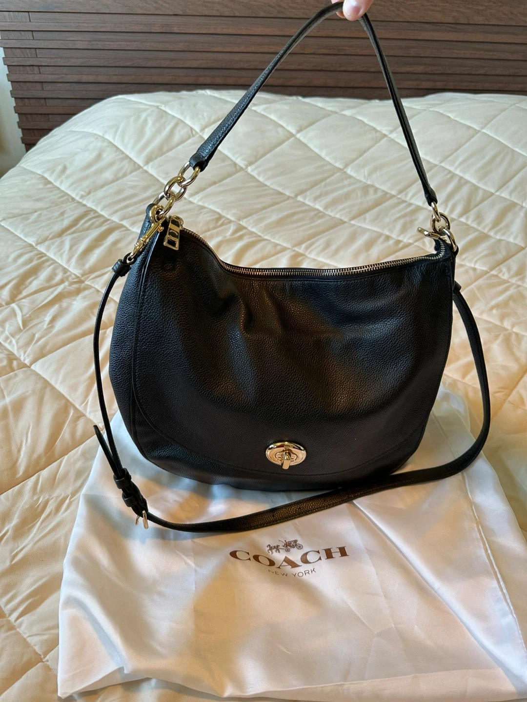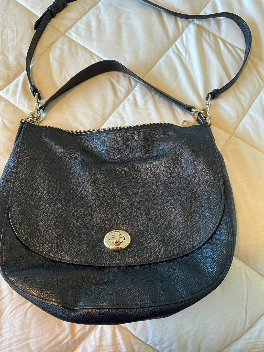 93Selling a Coach black leather crossbody bag! It's in great condition and comes with its original dust bag. This stylish bag is perfect for everyday use and adds a touch of elegance to any outfit. New bag carried 3 times just not my style.