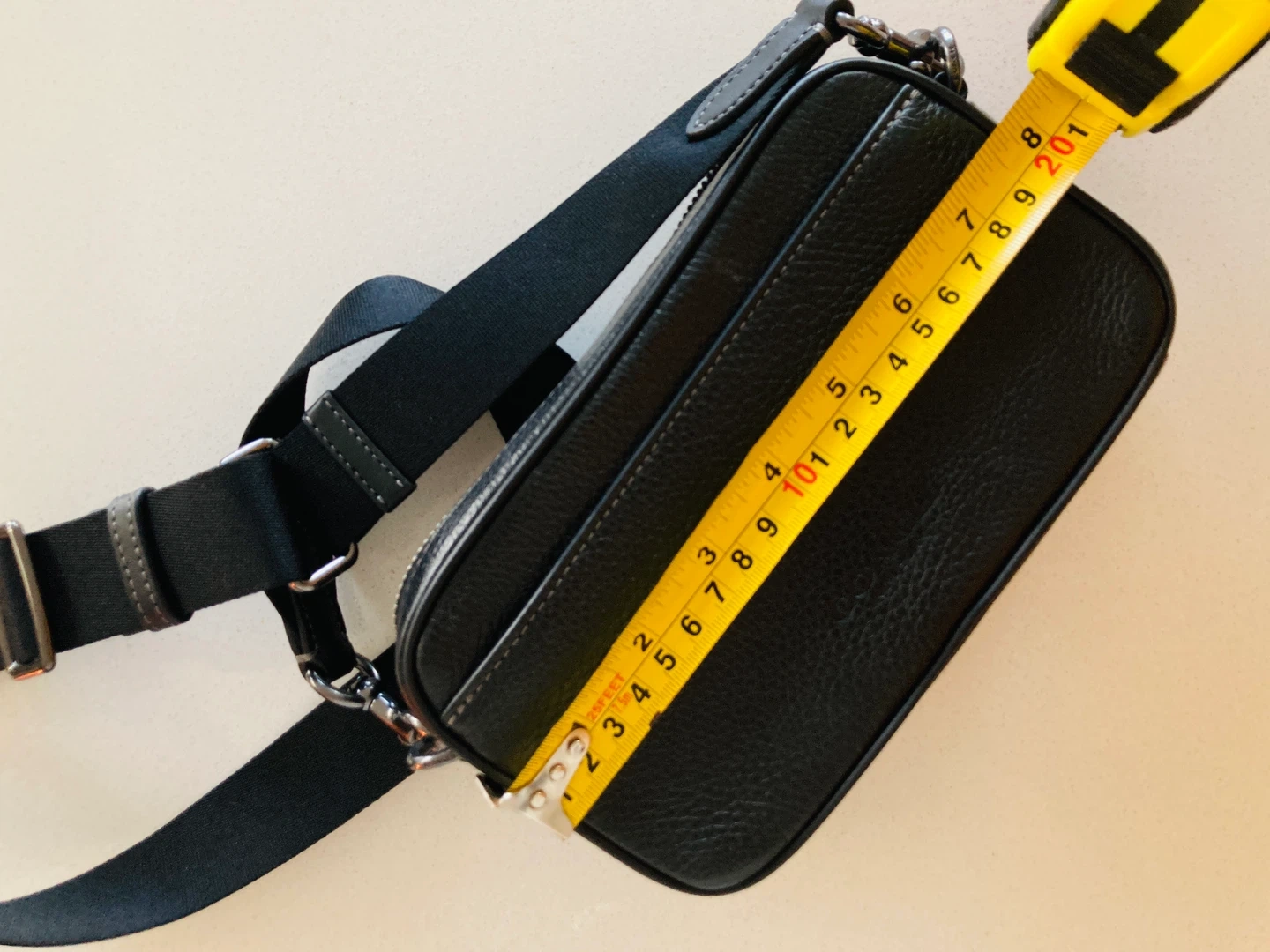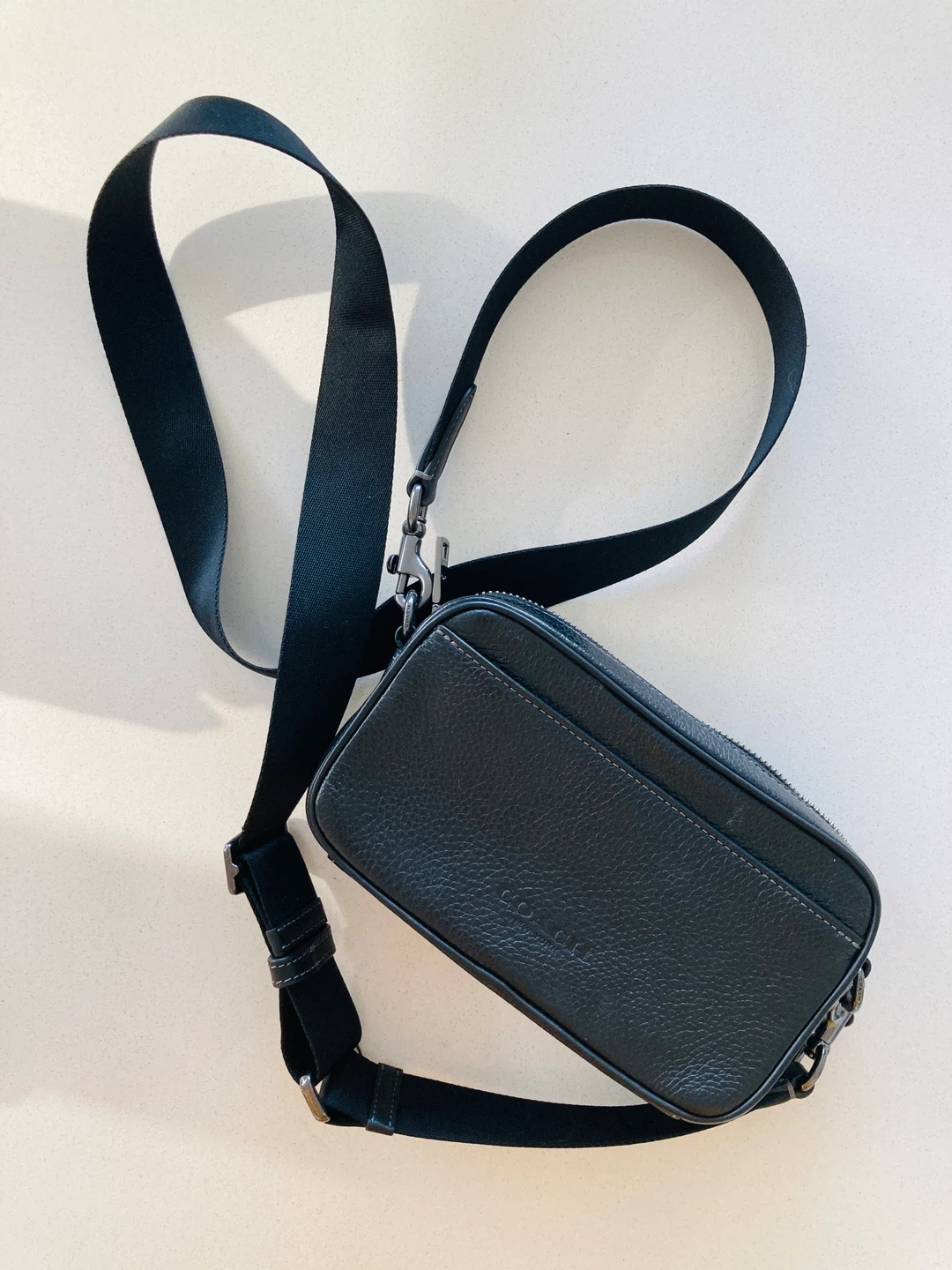 65Selling a stylish Coach crossbody bag in black leather! It's in great condition and perfect for everyday use. The bag features a durable strap and a compact design. The approximate dimensions are 8 inches in length.