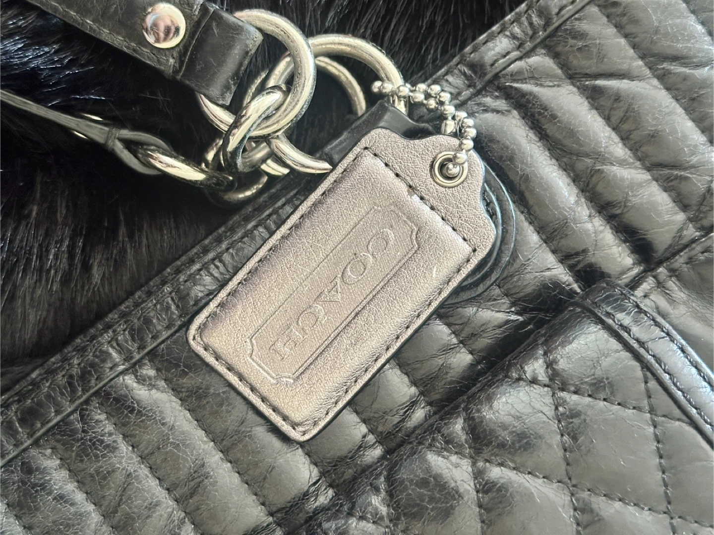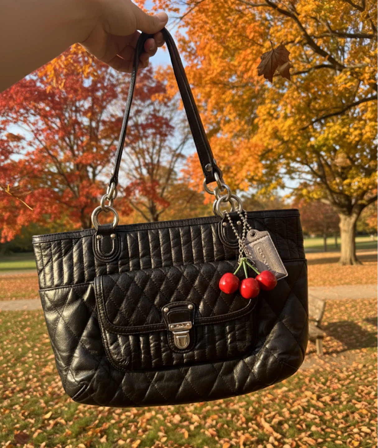 10This is a Coach bag handcrafted in China from the finest materials and leather. It’s a black quilted handbag with a silver clasp. The interior is a light blue colour. It has a tag with cherries on the side