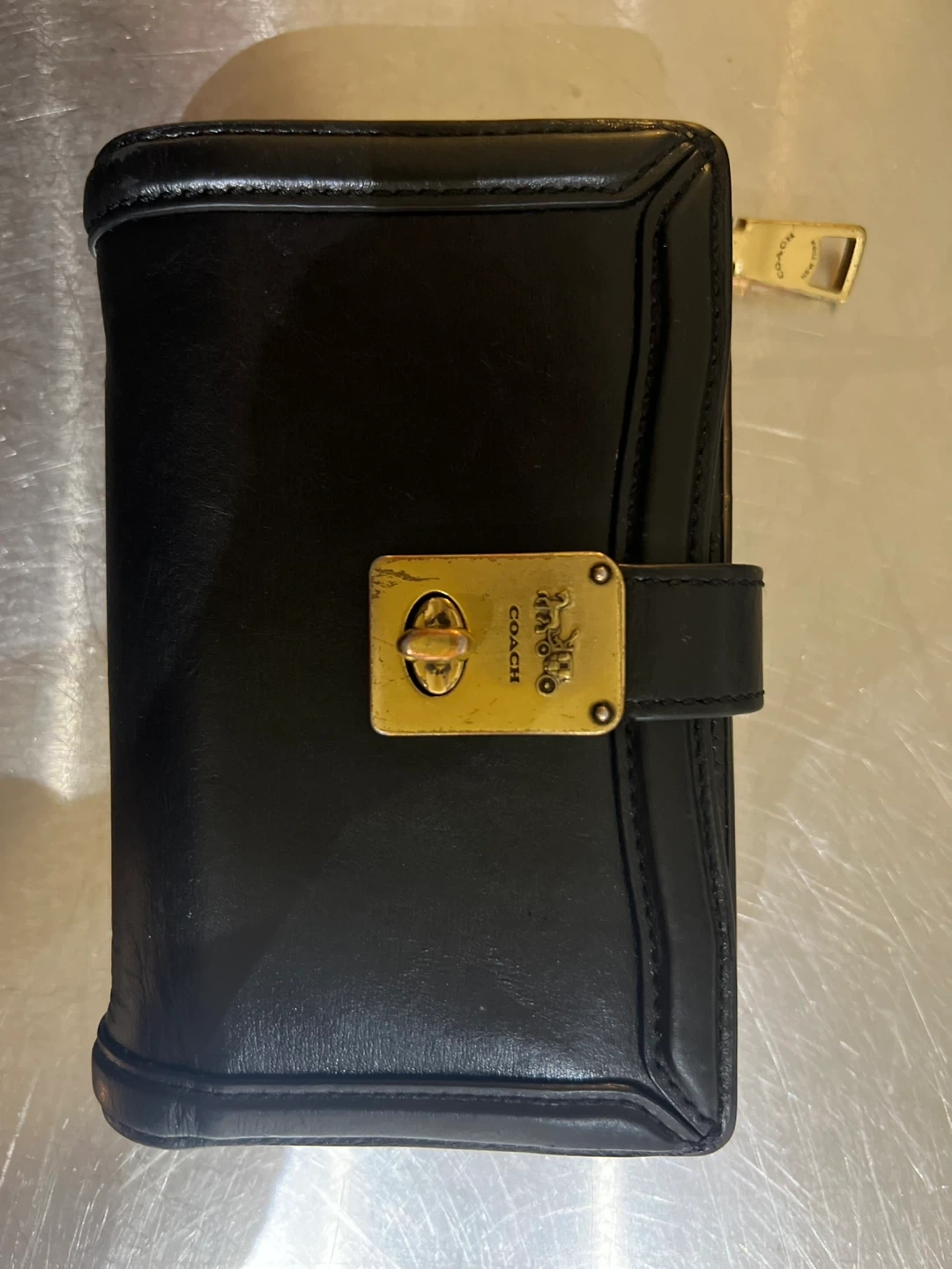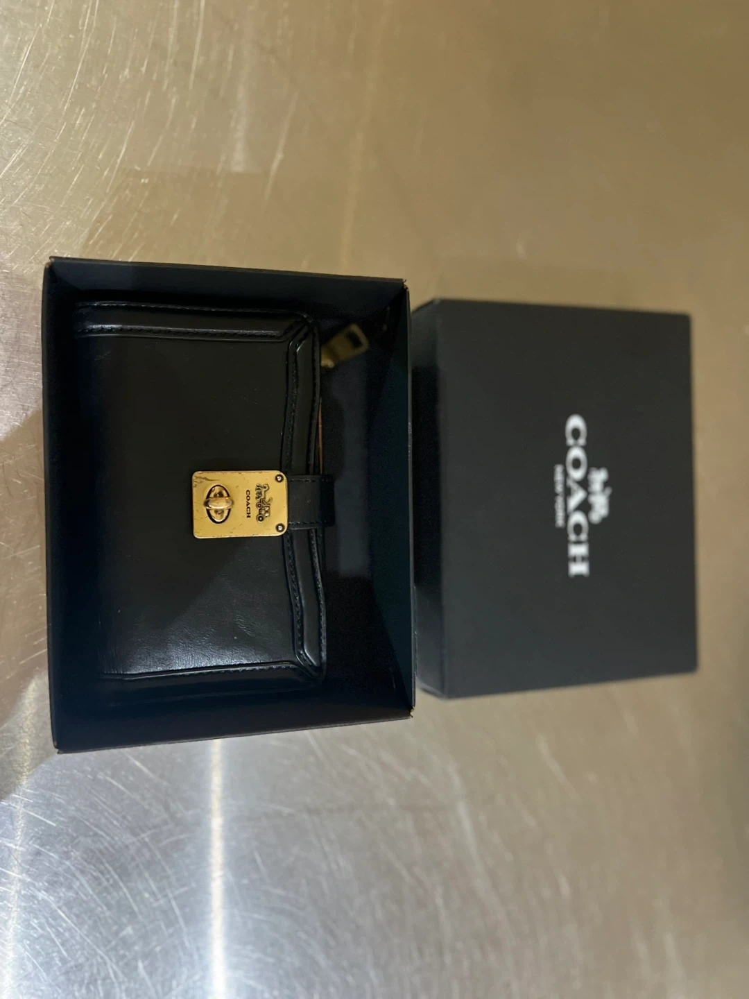 5Coach black leather wallet – excellent condition, includes original box. Small mark on clasp from factory. Pickup in Yaletown.