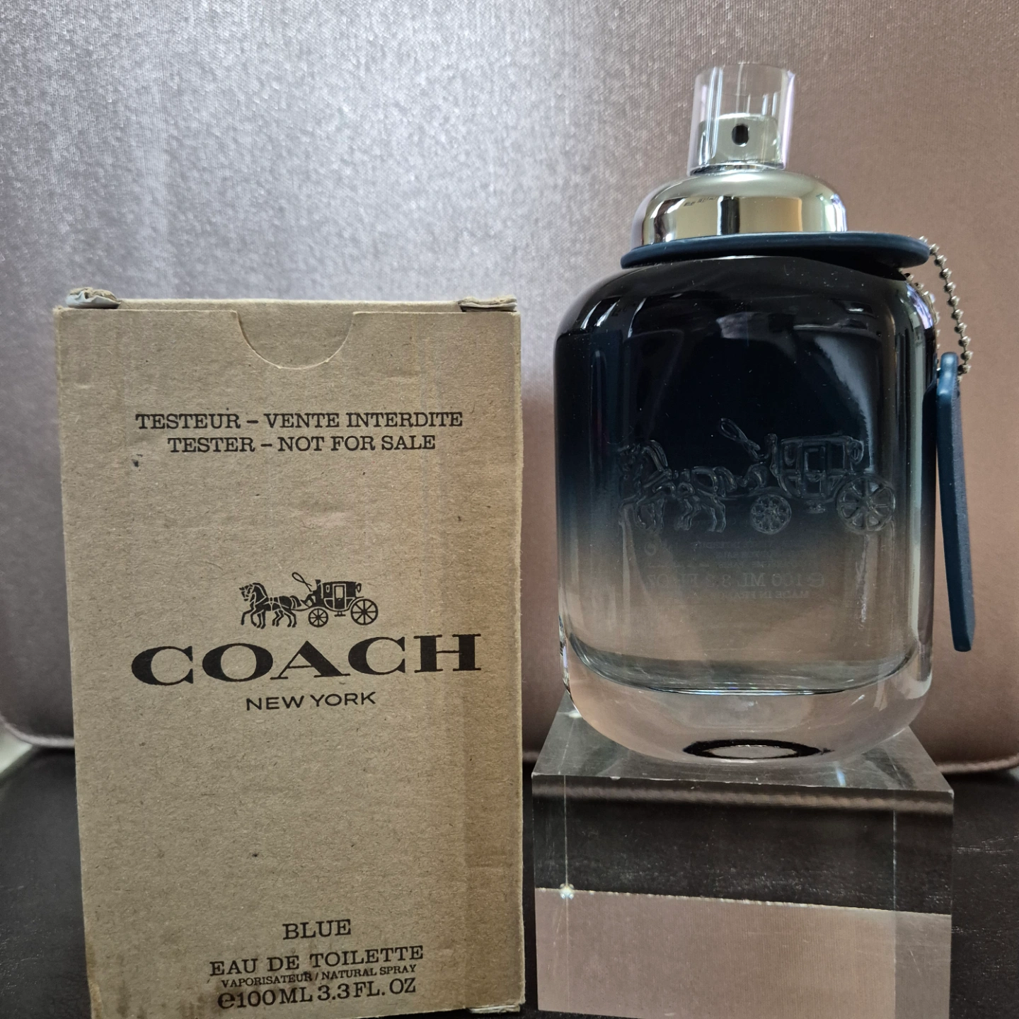 10A Coach fragrance, this is a blue Eau de Toilette with the tester label. The bottle has a unique shape with a silver cap and a blue string attached. The box is a cardboard colour with the brand's logo. You can use this every morning as a part of your self-care routine.