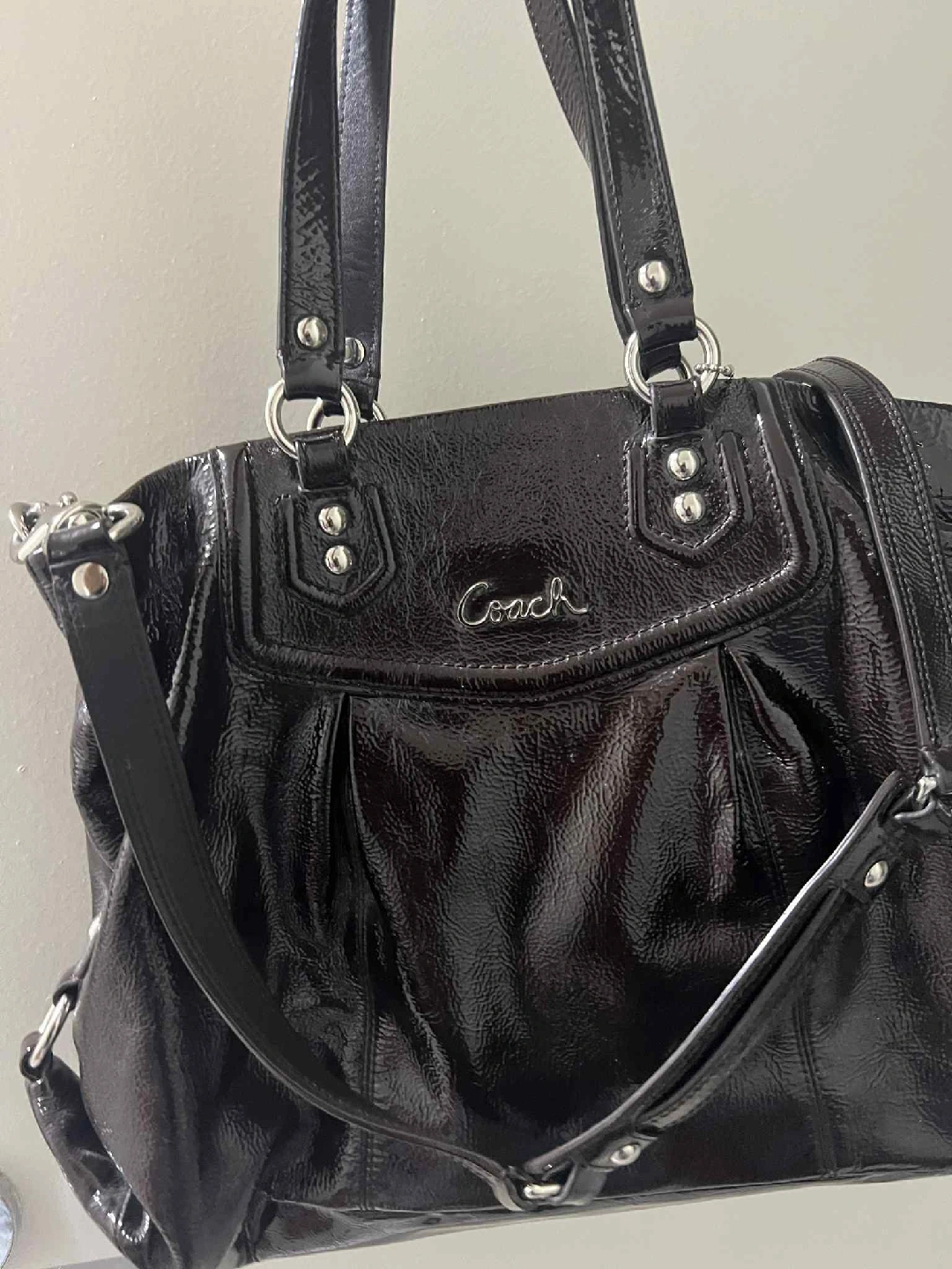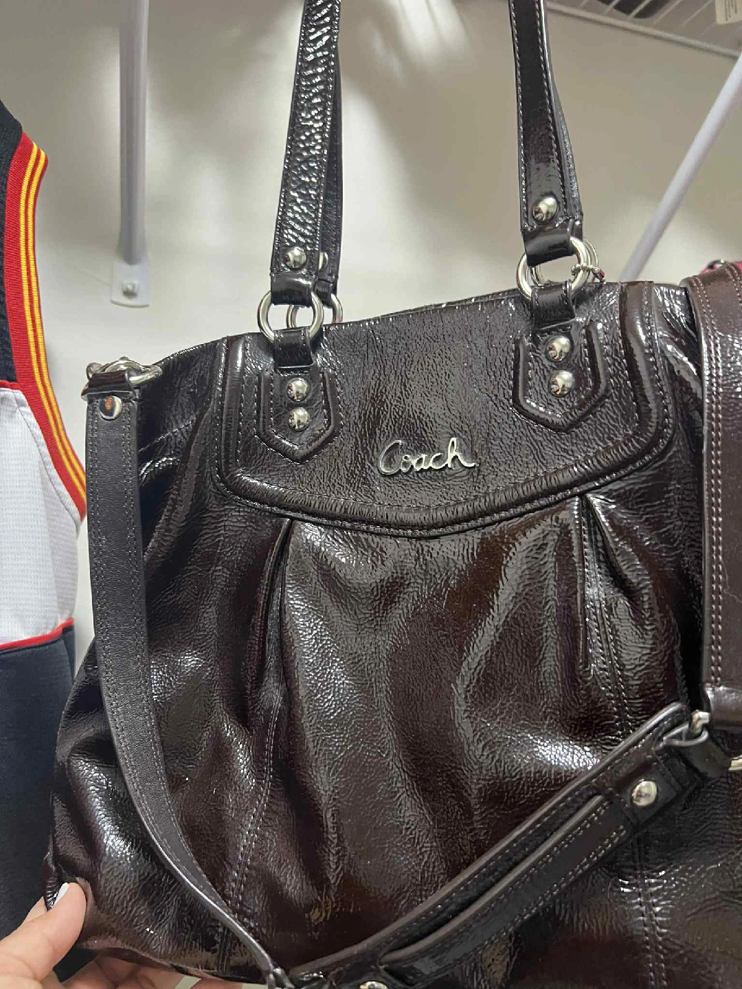 This is a stylish Coach tote bag in a beautiful brown patent leather. It has a classic design with silver hardware and a spacious interior with multiple pockets. Perfect for everyday use! pick up or deliver for free
