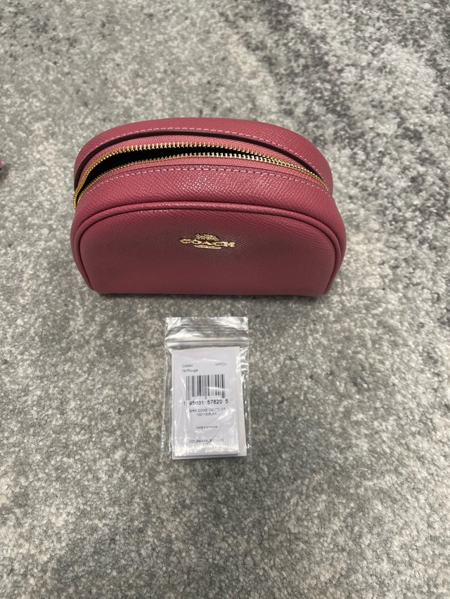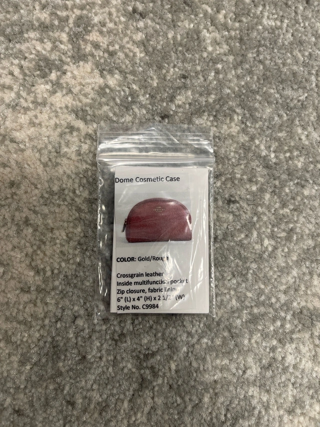 19This is a brand new Coach Dome Cosmetic Case in a beautiful rouge colour! This stylish case features crossgrain leather and a gold-tone zip closure and inside multifunction pocket, perfect for keeping your essentials organized. The compact size makes it ideal for travel or everyday use. Here are some more details: * Crossgrain leather * Inside multifunction pocket * Zip closure, fabric lining * 6" (L) x 4" (H) x 2 1/2" (W) * Style No. C9984