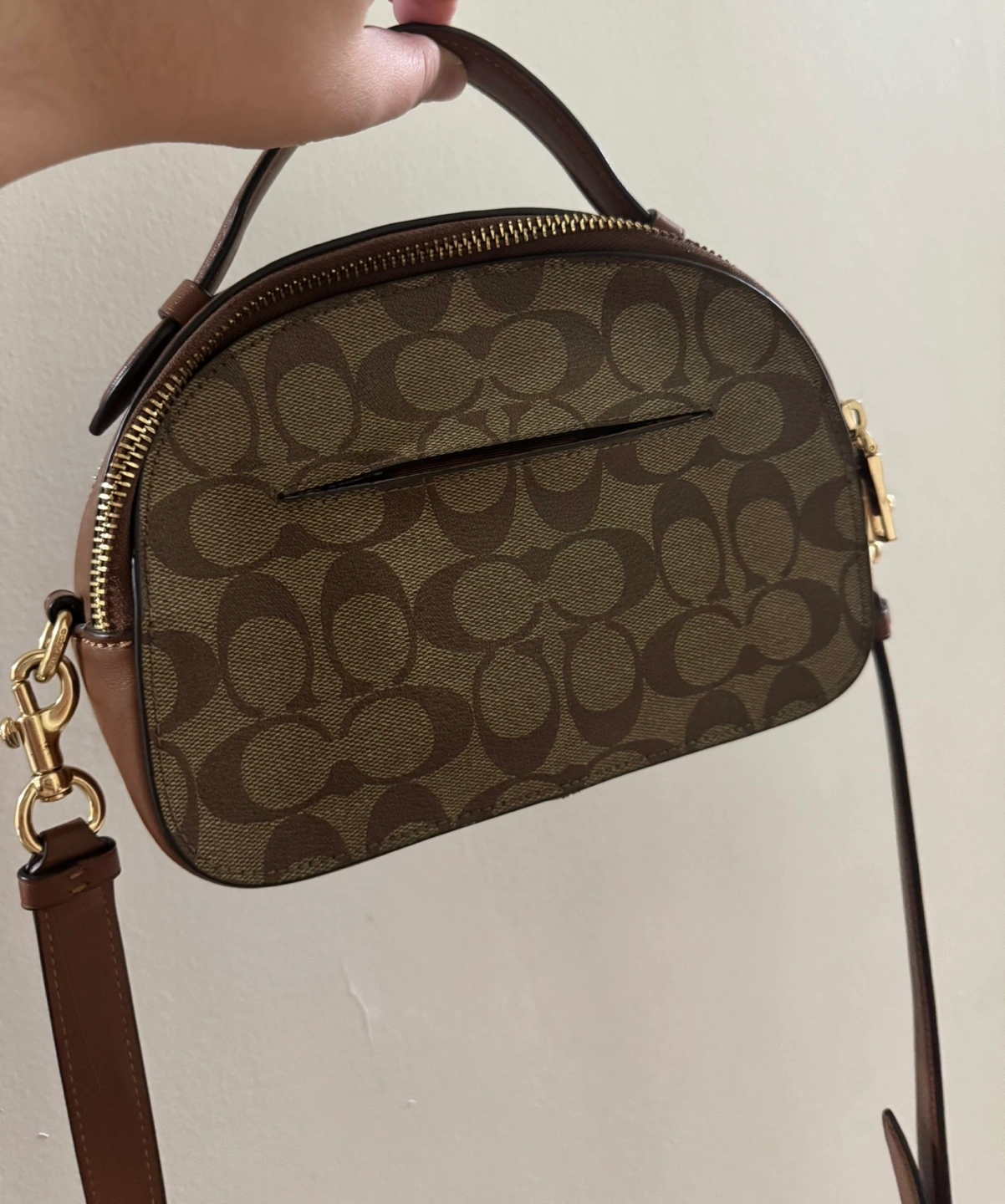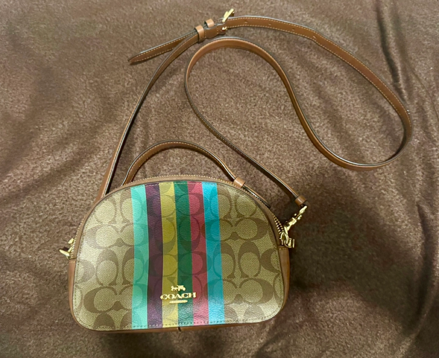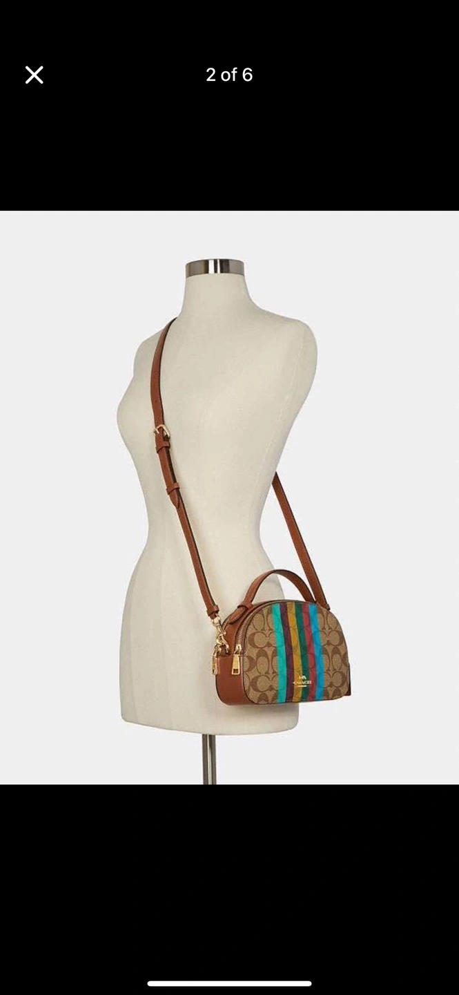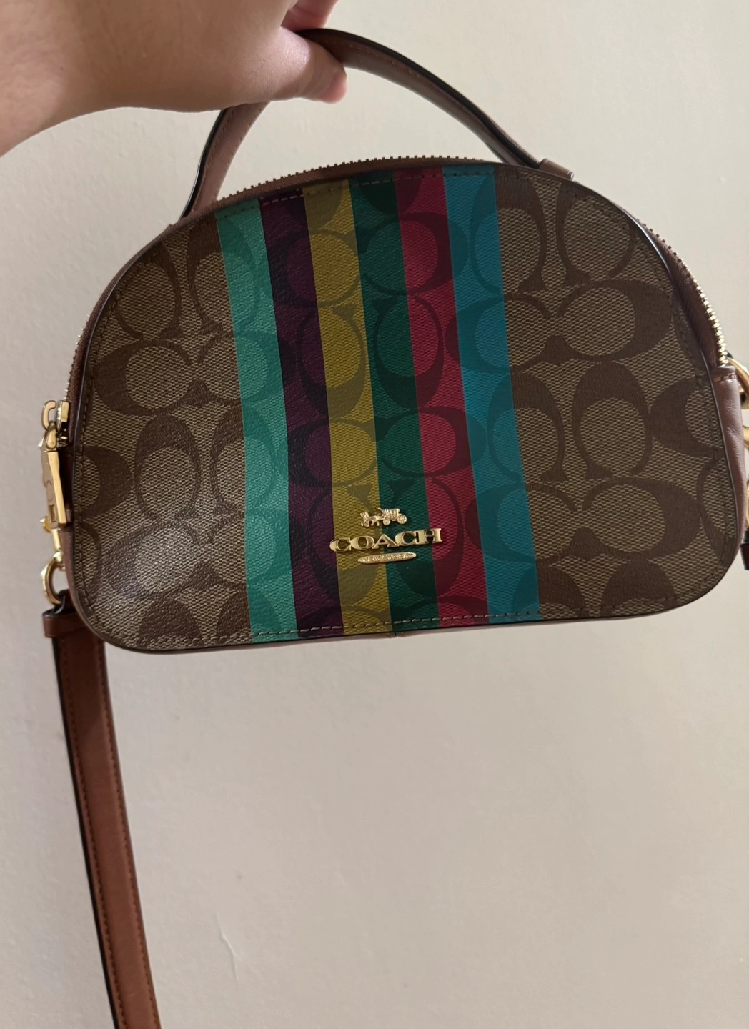 10Adorable Coach crossbody bag. Features a half-moon shape, adjustable strap, and signature Coach pattern. Multicoloured stripes add a pop of colour. Perfect for everyday use.
