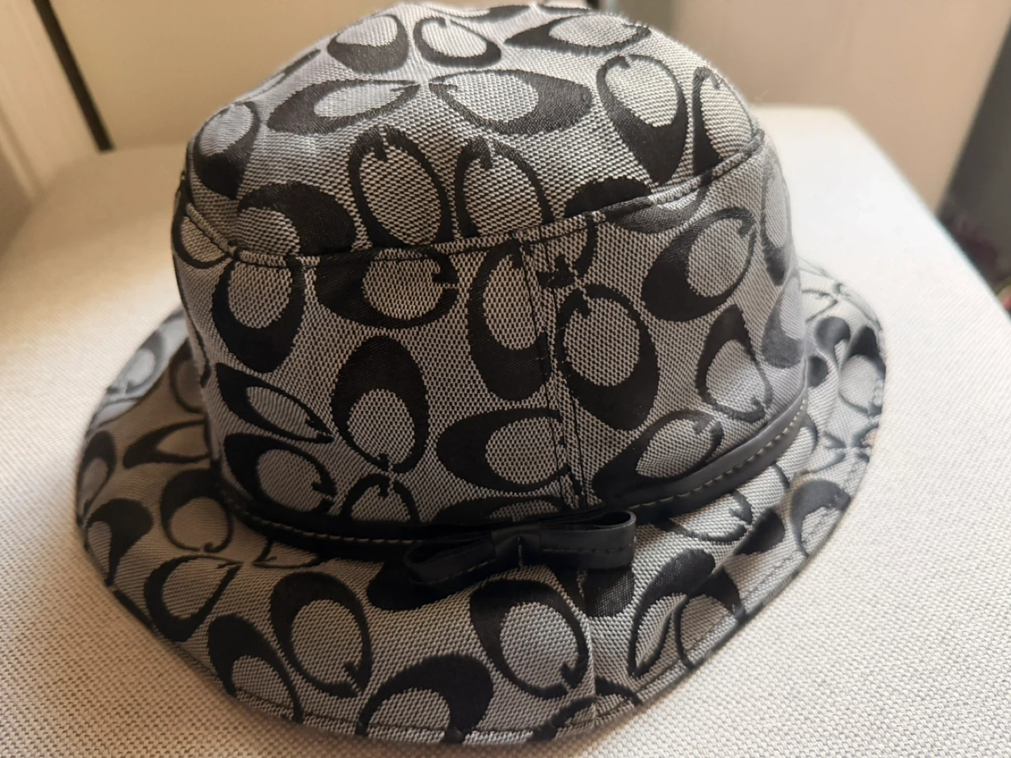 89Stylish Coach hat featuring a black and grey pattern. It's in great condition and perfect for adding a touch of designer flair to your outfit!