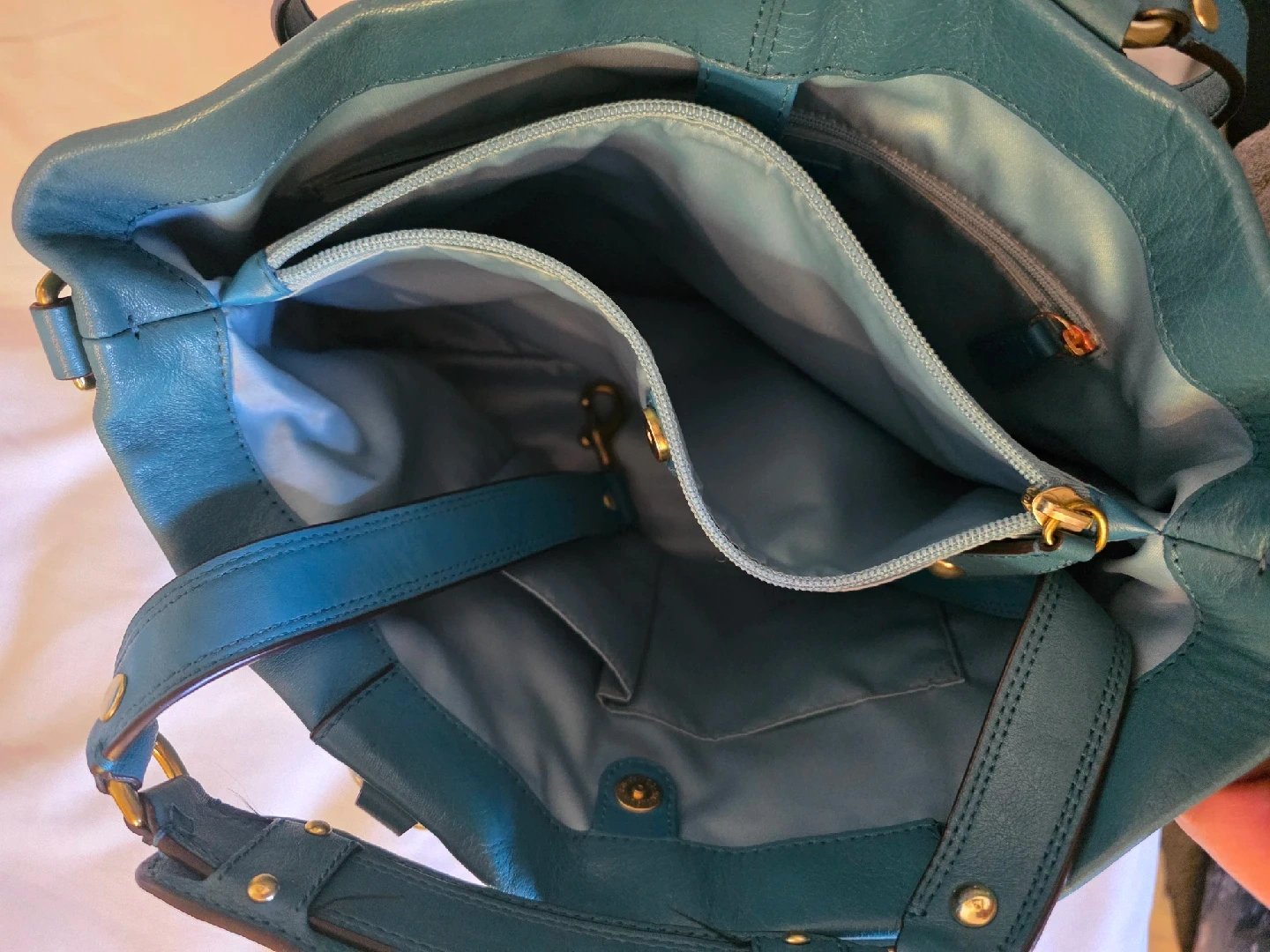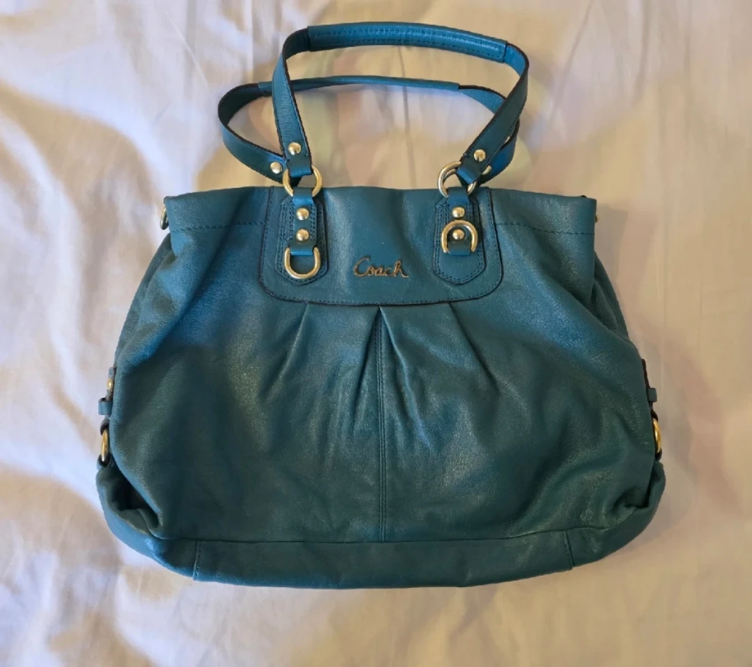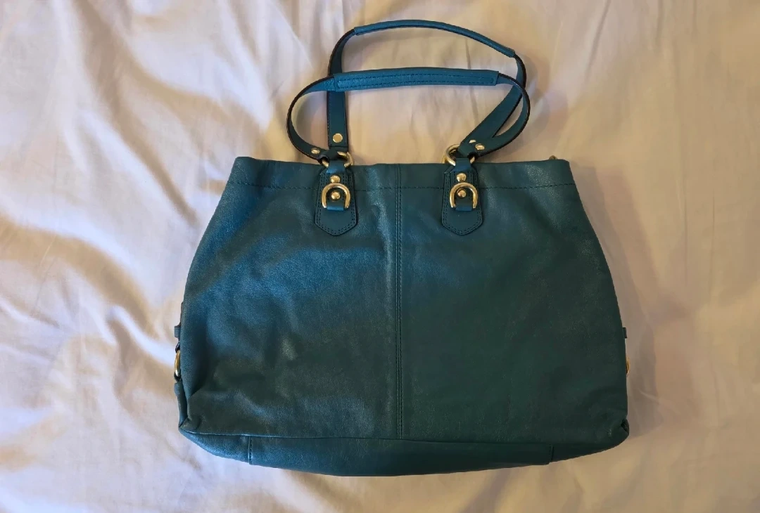 86Momma is updating her wardrobe. Selling a lovely teal Coach leather handbag. It’s in great condition and ready for a new home! Perfect for everyday use or special occasions. Has multiple compartments inside for easy organization. Comes with long strap.