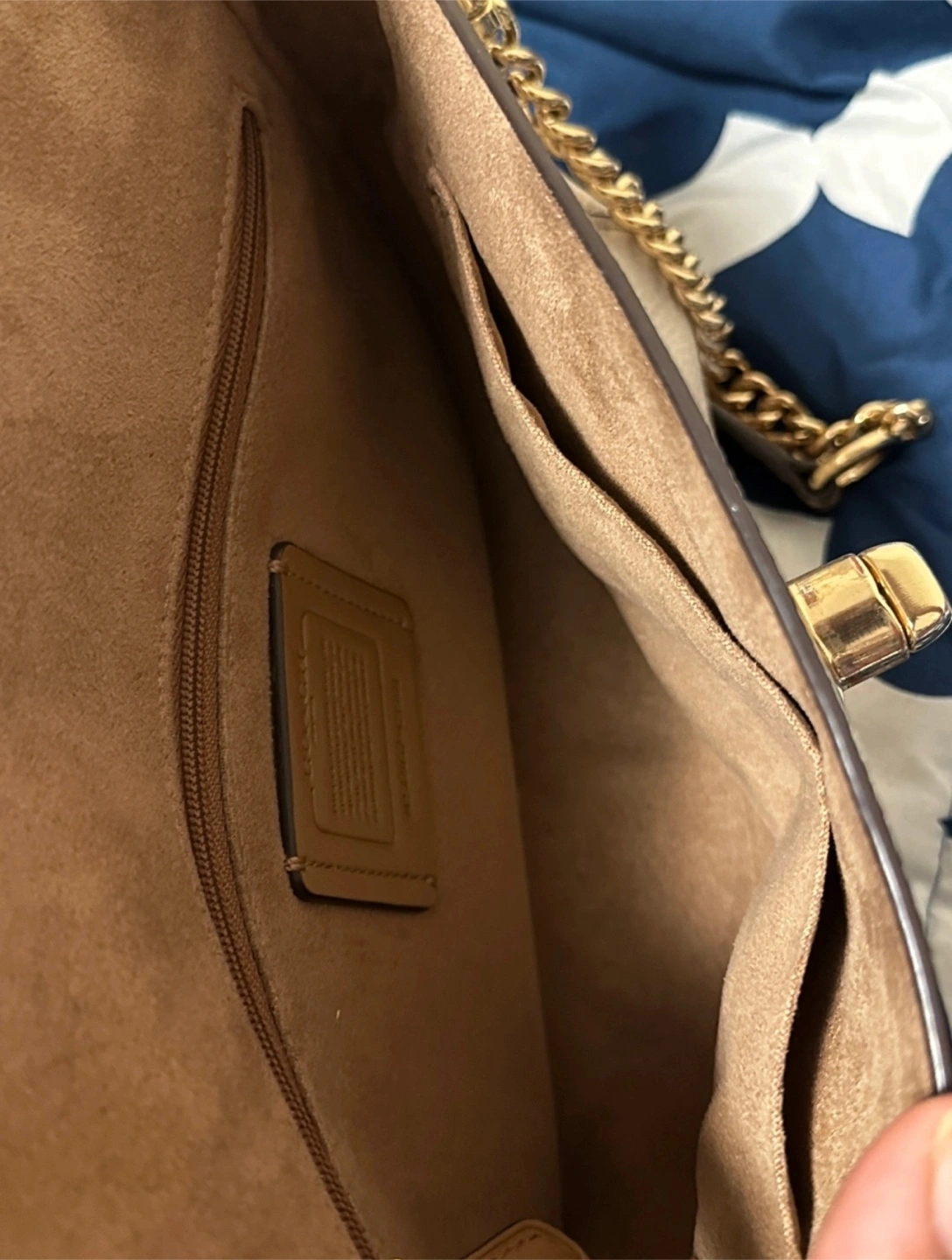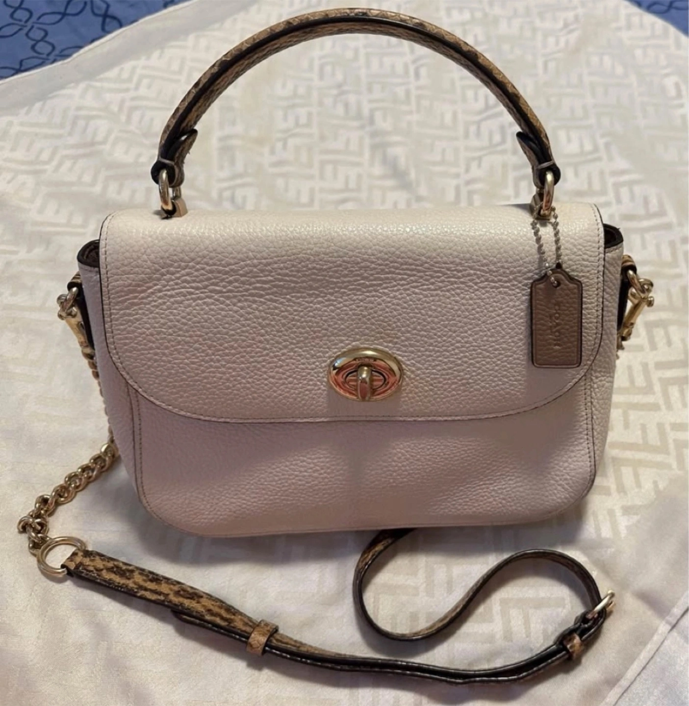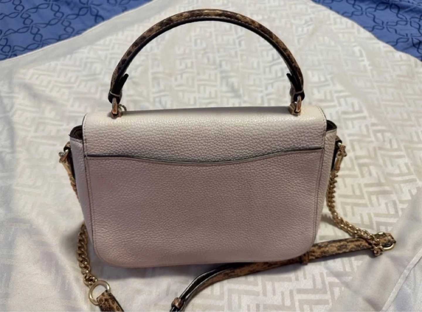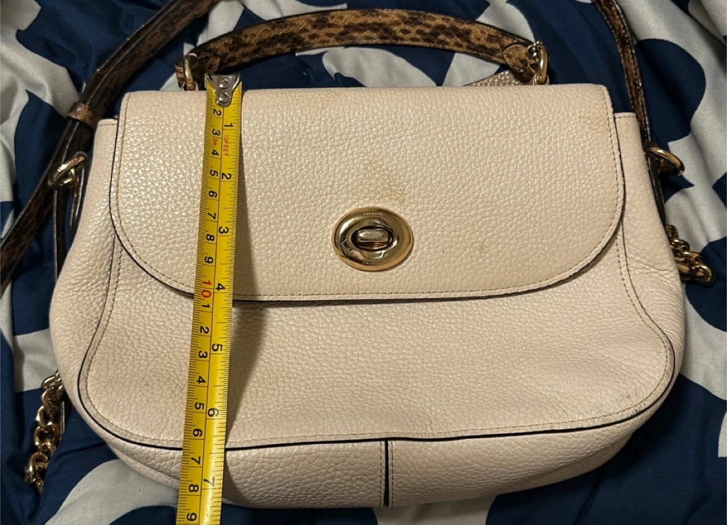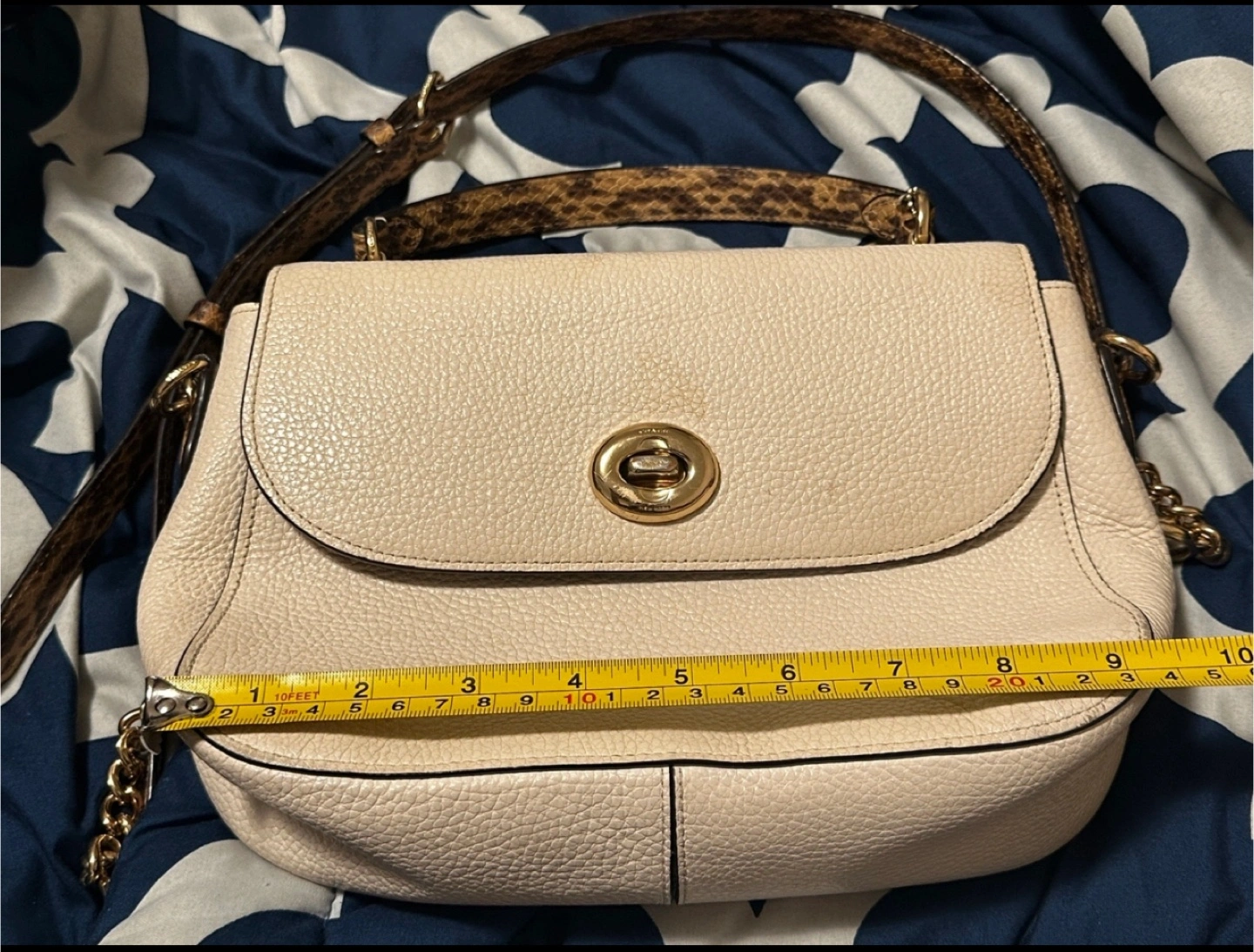 207Great deal!!! This is a cute Coach satchel bag! It's leather with a unique snakeskin-like handle and chain detailing. The colour is a lovely neutral, and it measures approximately 9 inches across. pick up only!