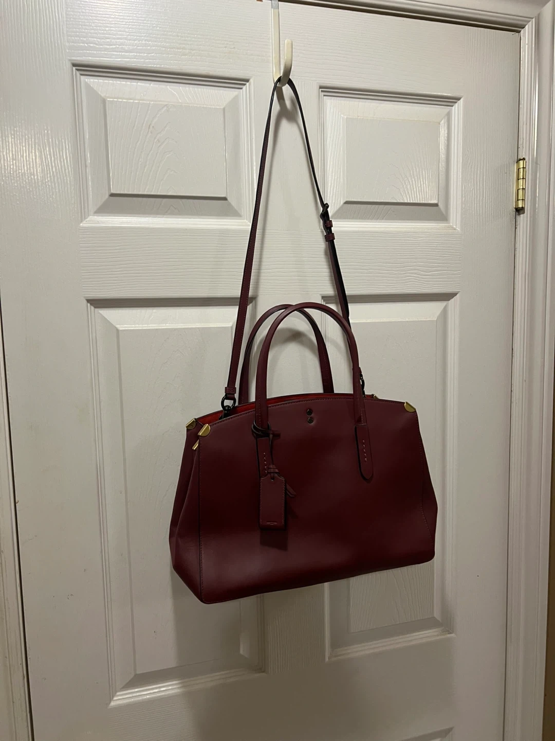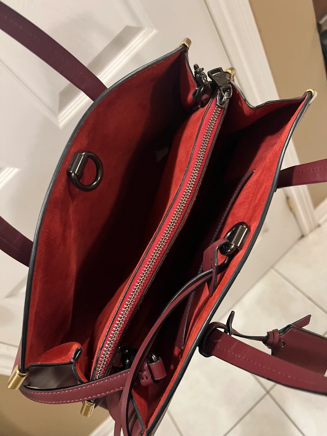 86Selling a beautiful Coach satchel in a rich burgundy colour! It's made of leather and has a classic, timeless design. Perfect for everyday use or special occasions. The interior is red and has a zipper. It's in great condition! Comes with a coach key chain