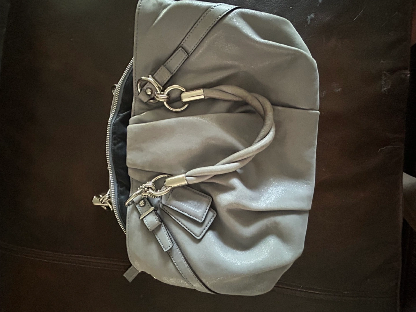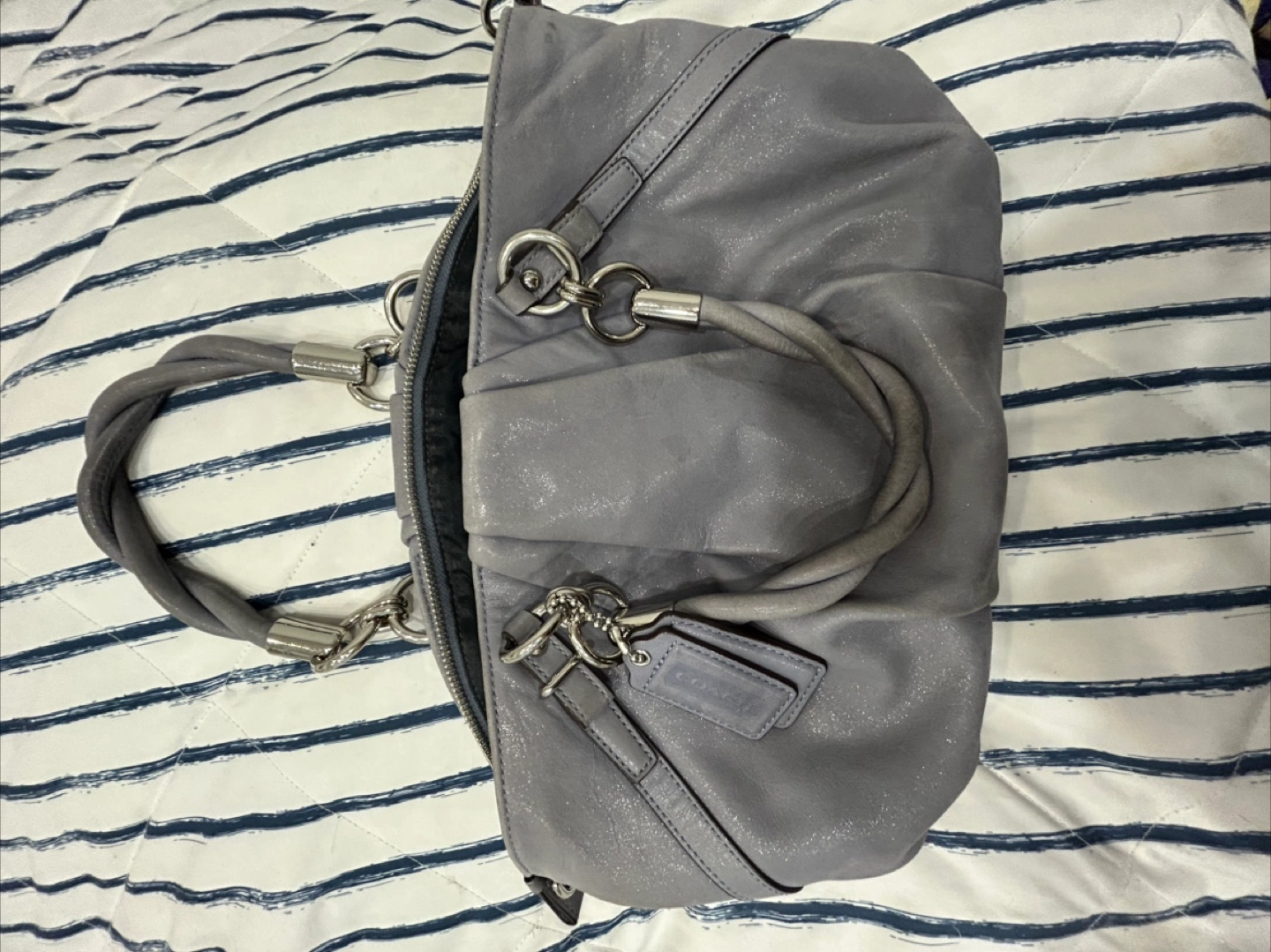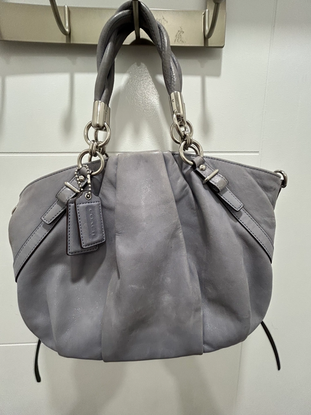 Selling a gently used Coach leather satchel in a lovely grey colour. Shimmering in the light .It's in great condition and has a stylish design. The model number is J1293-F22563. It's a perfect everyday bag!