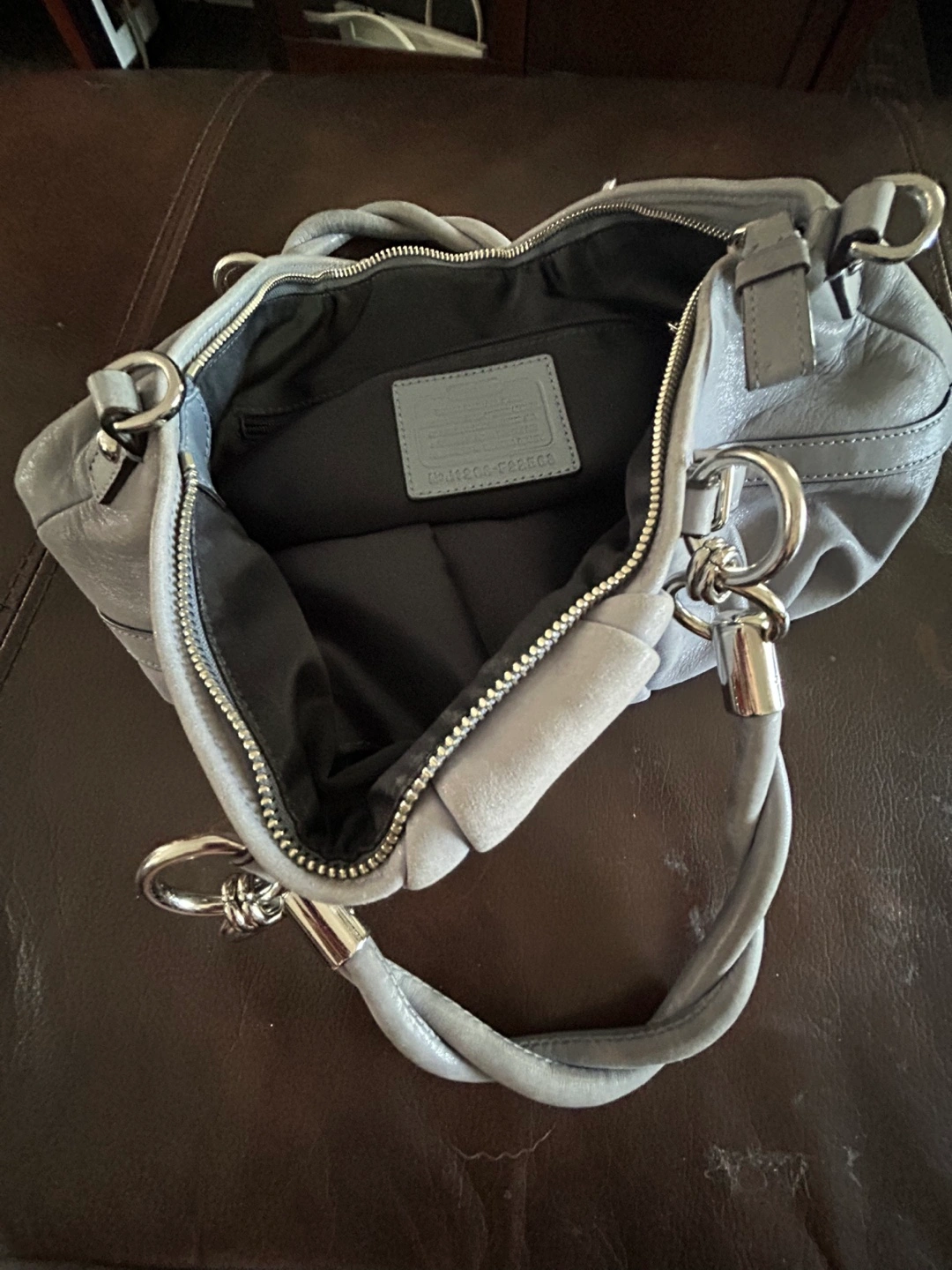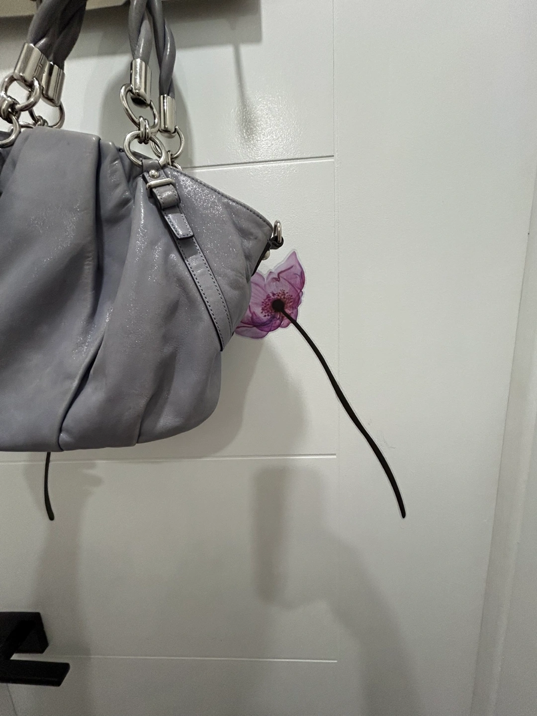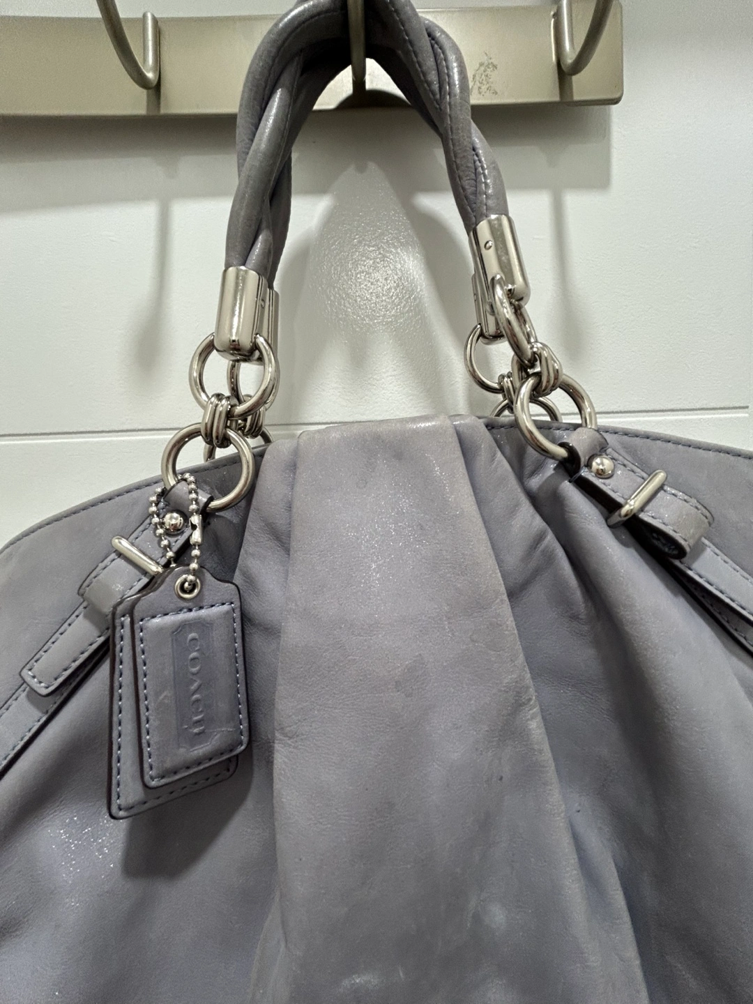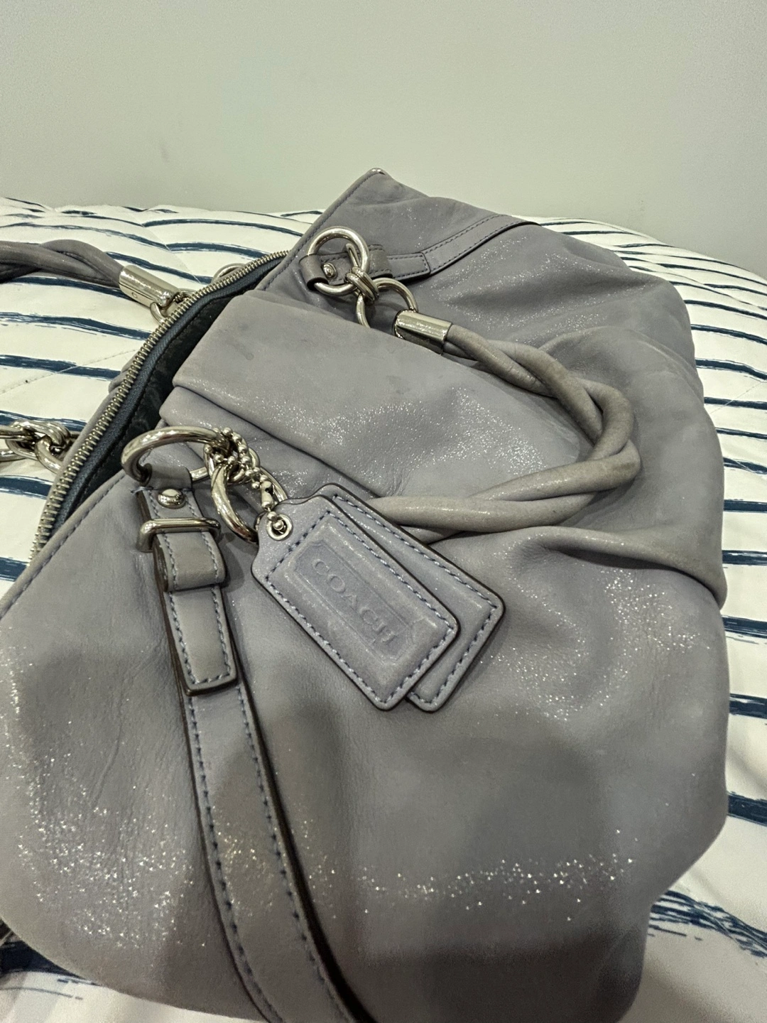 Selling a gently used Coach leather satchel in a lovely grey colour. Shimmering in the light .It's in great condition and has a stylish design. The model number is J1293-F22563. It's a perfect everyday bag!
