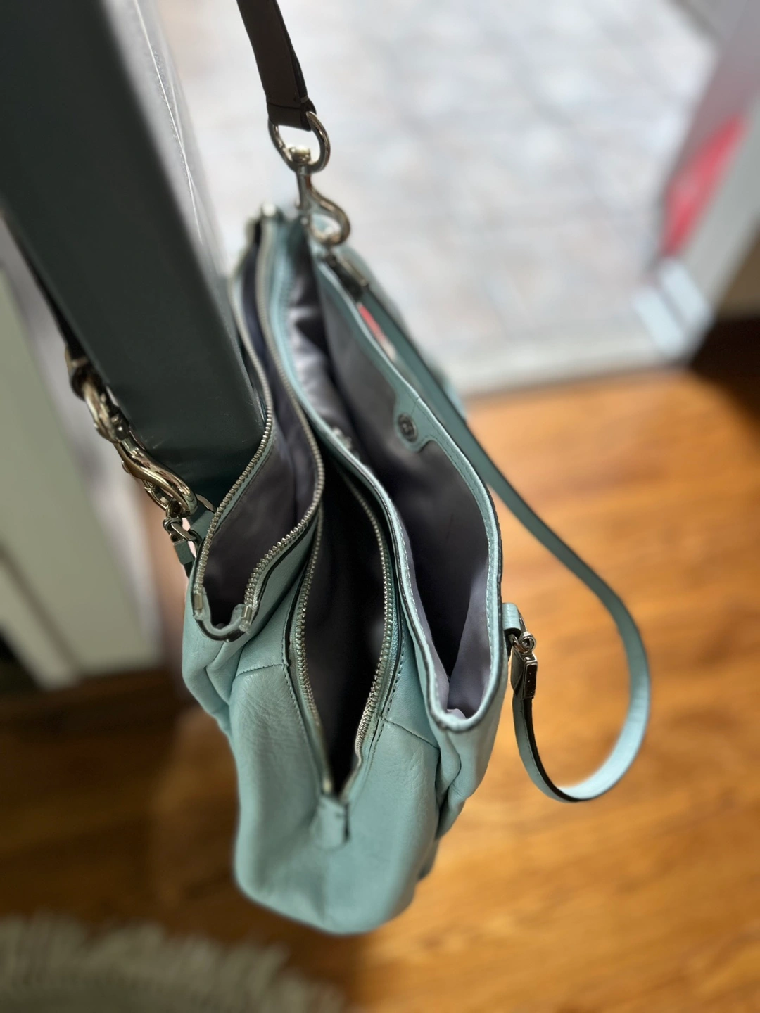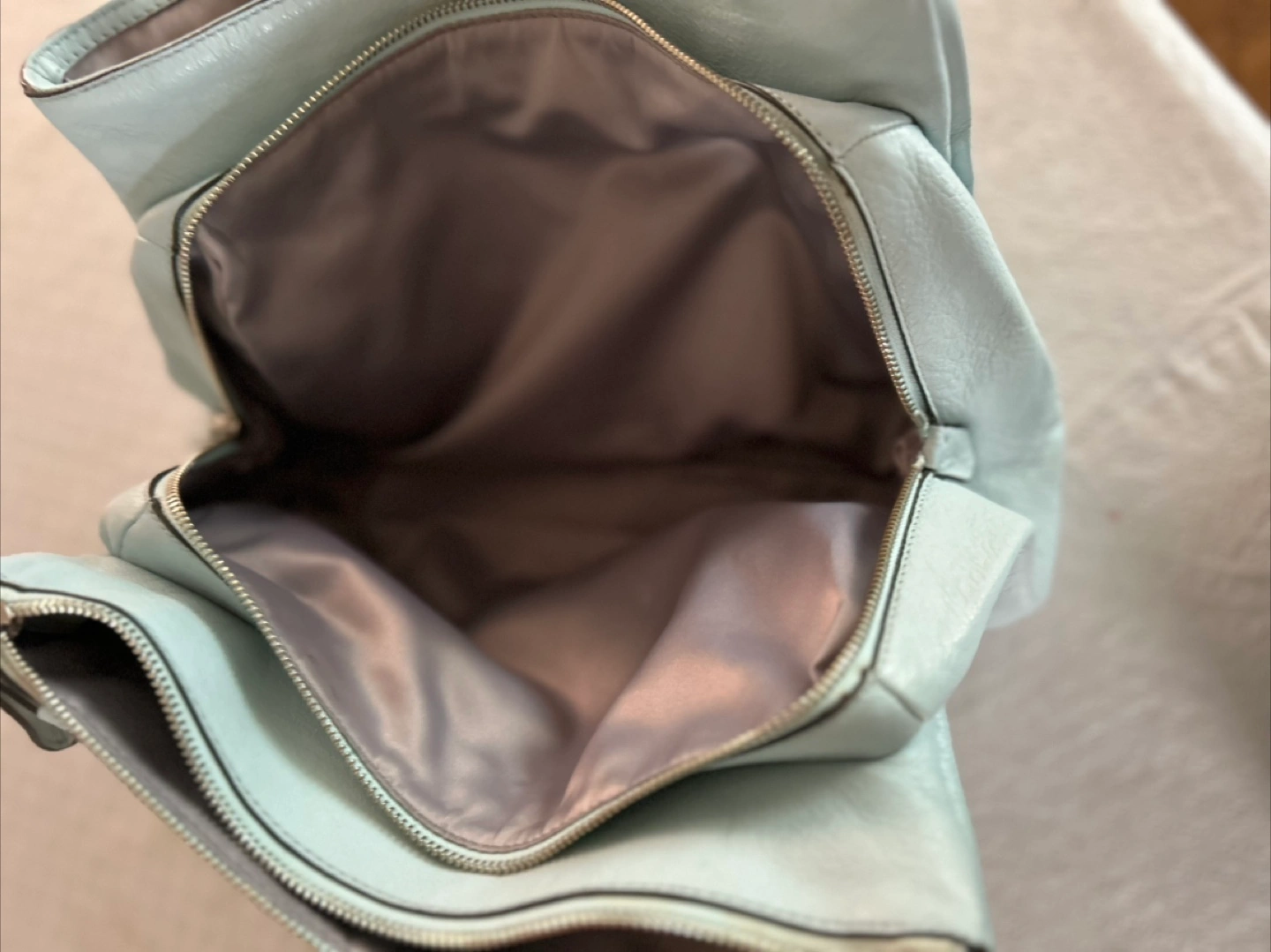 Beautiful light blue leather Coach satchel. Features two top handles and a detachable shoulder strap. Zip closure. Excellent condition. Multi components , fits a laptop, extended shoulder strap that can be removed. No stains , super clean inside and out.