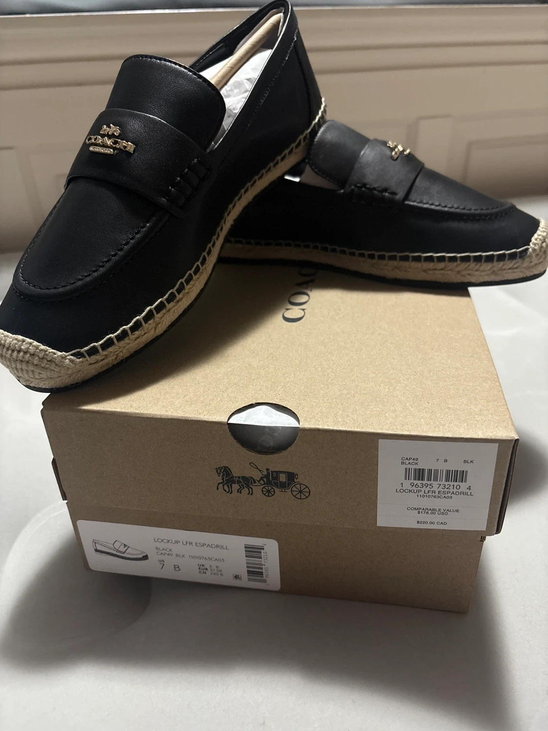 Selling a pair of Coach Lockup LFR Espadrill shoes in black, size 7B! They come with the original box. The comparable value is $220 CAD