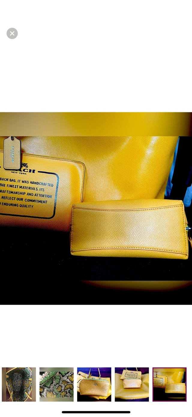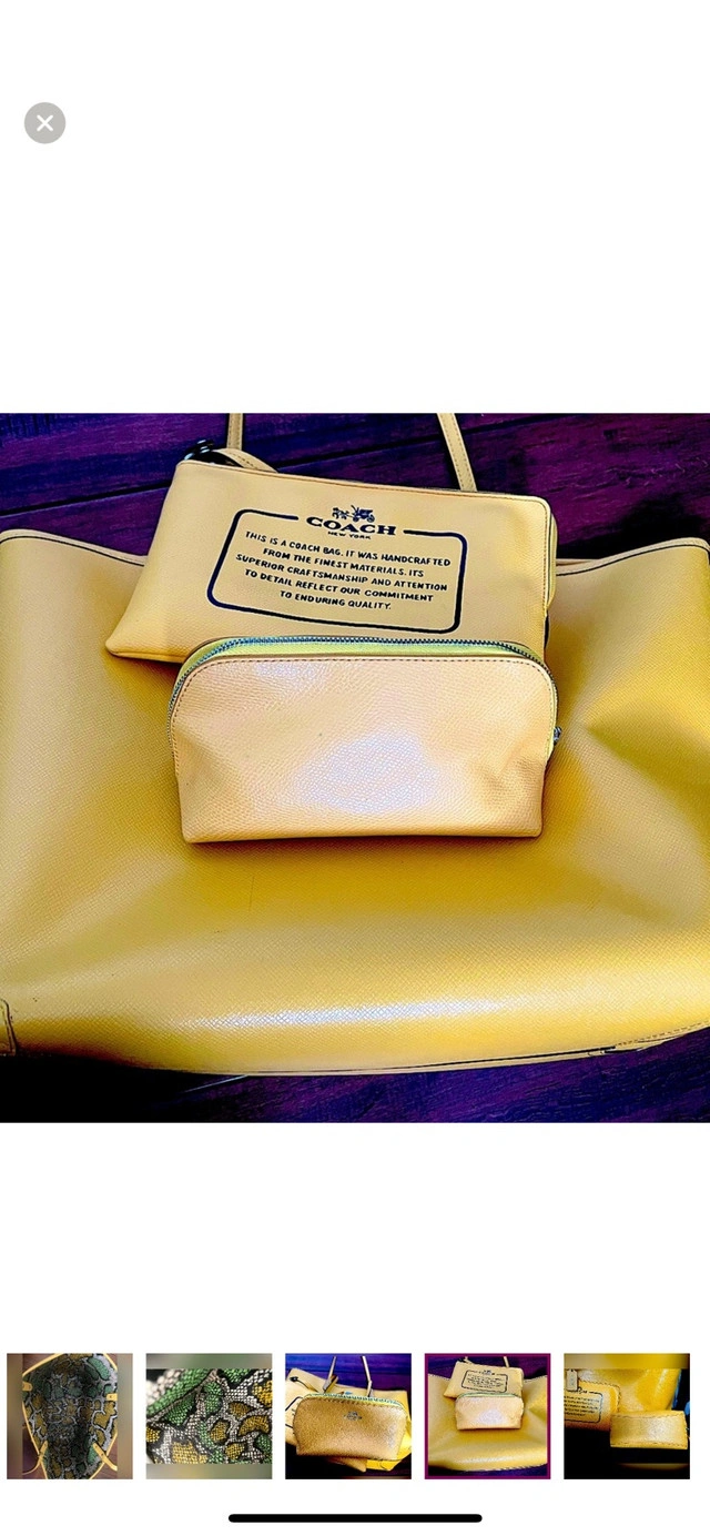 98This is a cute, mustard yellow Coach makeup bag, perfect for keeping your essentials organized! This stylish pouch is in used condition but has plenty of life left. Specifications: - Brand: Coach - Colour: Mustard Yellow - Material: Leather - Closure: Zipper Condition: New For Sale By: Owner