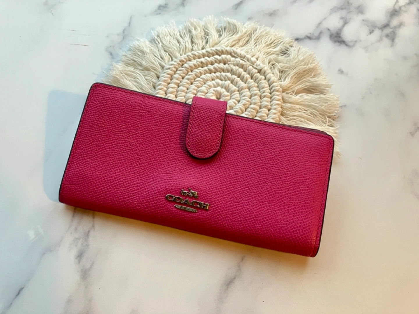 Pink leather wallet with multiple card slots and a zippered compartment. Has a flap closure with a snap button. In excellent condition. Pick up in Kerrisdale or Downtown Thierry.