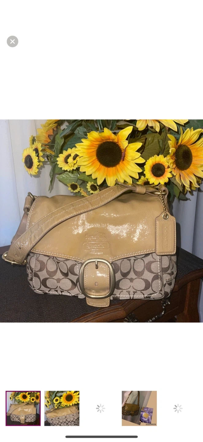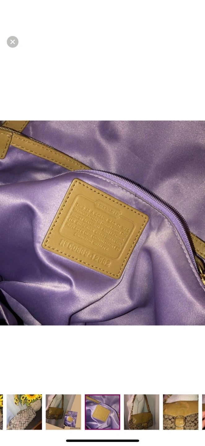 26Selling a Coach satchel bag. It has a brown and tan colour scheme with the classic Coach pattern. The interior is a lovely purple colour