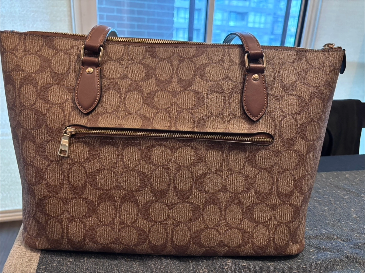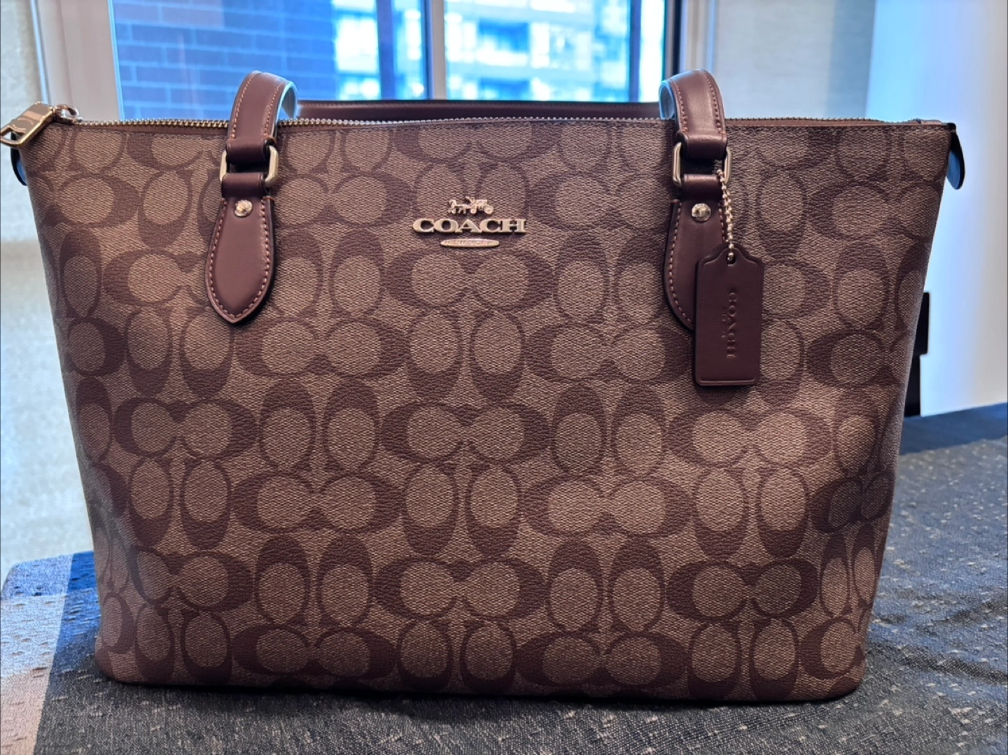 Here's a stylish Coach tote bag in a signature brown pattern! It’s perfect for everyday use and has plenty of room for all your essentials. The bag is in great condition and ready for a new home Used for work for a week but moved back to laptop bag to carry 2 laptops at a time Inside zip, cell phone and multifunction pockets Zip-top closure, fabric lining Outside zip pocket Handles with 10 1/2" drop 14 1/2" (L) x 9 3/4"(H) x 6" (W)